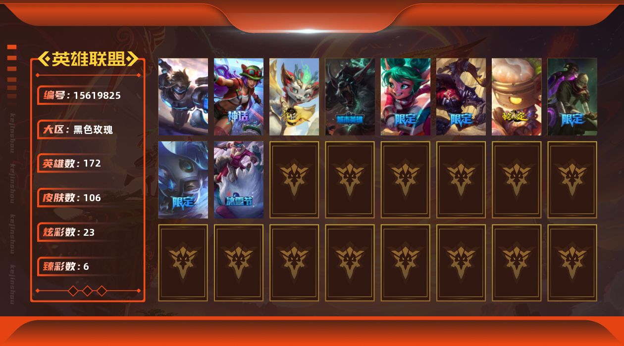 [15619825]【店主推荐捡漏号】未定级段位-172英雄-106皮肤-23炫彩-1终极-1神话-9限定-12传说-24史诗