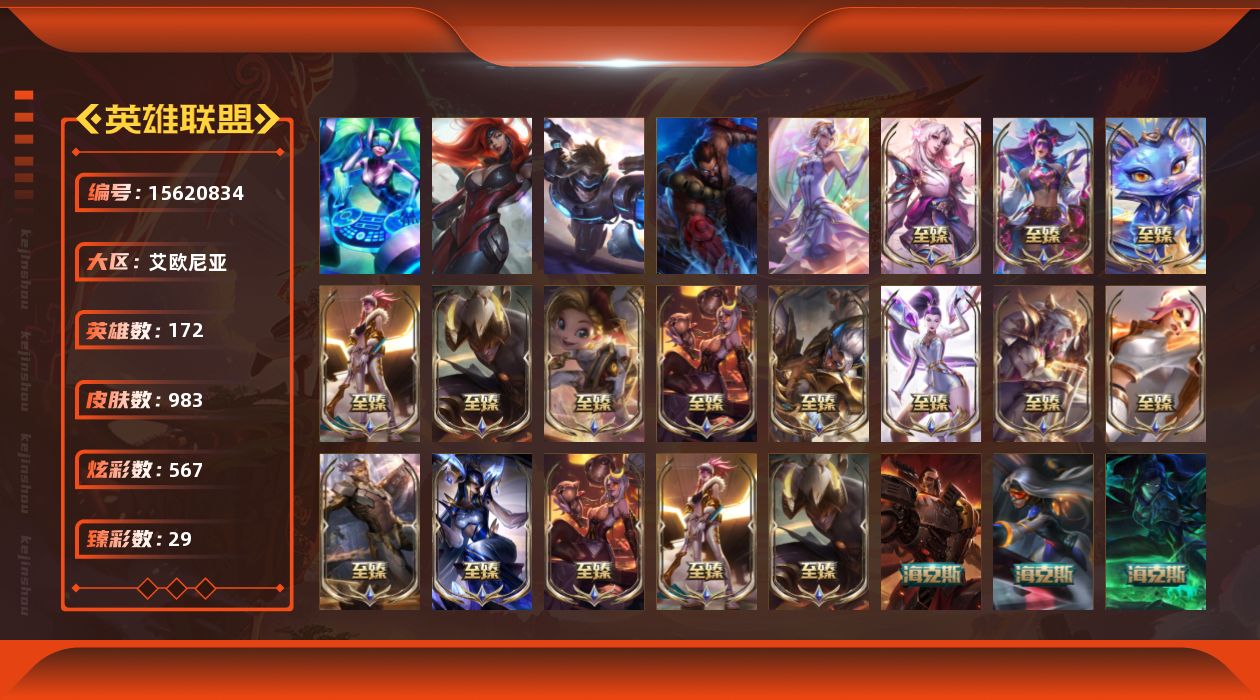 【至臻皮肤】:至臻黑夜使者李青,至臻黑夜使者李青(2022),至臻烈焰美人薇恩,至臻烈焰美人薇恩(2022),至臻KDA阿卡丽,至臻KDA阿卡丽(2022),至臻幻灵狮心蕾欧娜,至臻灵魂莲华拉克丝,至臻福牛守护者菲奥娜,至臻青花瓷丽桑卓,至臻女帝黛安娜,至臻奥术师佐伊,至臻KDAALLOUT卡莎,至臻人工智能悠米,至臻源计划逆流塞拉斯,至臻神龙尊者炎龙瑟提