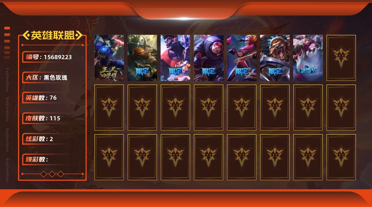 未定级段位-76英雄-115皮肤-2炫彩-0终极-0神话-9限定-13传说-30史诗