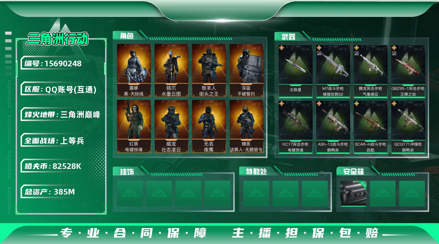[15690248]【店主推荐捡漏号!可直接换绑】总资产385m 82528k哈伏币-326m流动资产-60烽火等级-三角洲巅峰-50战场等级-上等兵 【干员外观】:骇爪-水墨云图,露娜-黑·天际线,威龙-壮志凌云,蜂医-送葬人·无题密令,牧羊人-街头之王,无名-夜鹰,深蓝-不破誓约,红狼-电锯惊魂 【近战皮肤】:近战-北极星,近战-黑鹰 【典藏外观】:QBZ95-1突击步枪-王牌之剑,腾龙突击步枪-气象感应,M7战斗步枪-棱镜攻势S2,K437突击步枪-私人定制,AWM狙击步枪-私人定制,AK-12突击步枪-阿萨拉卫队,M870霰弹枪-阿萨拉卫队,AKM突击步枪-青纹,K416突击步枪-星之彩,MP5冲锋枪-星之彩,M14射手步枪-天际线,沙漠之鹰-天际线,M4A1突击步枪-雪地迷彩,ASh-12战斗步枪-雪地迷彩,M4A1突击步枪-纯白涂装,SCAR-H战斗步枪-纯白涂装,AK-12突击步枪-水墨迷彩,AS Val突击步枪-蝴蝶,QCQ171冲锋枪-凶兽 【传说级普通外观】:M4A1突击步枪-阿米娅,ASh-12战斗步枪-鹅鸭杀,M7战斗步枪-神秘艺术,M7战斗步枪-维京,AK-12突击步枪-夜鹰,AK-12突击步枪-特斯拉线圈,SCAR-H战斗步枪-铁艺苍穹,SCAR-H战斗步枪-水墨云图,SCAR-H战斗步枪-启航,G3战斗步枪-流光铂影,CAR-15突击步枪-阿米娅,AS Val突击步枪-蛇年祥瑞,腾龙突击步枪-捞点薯条,K437突击步枪-北极星,KC17突击步枪-电锯惊魂,P90冲锋枪-神秘艺术,UZI冲锋枪-特斯拉线圈,SMG-45冲锋枪-骑士,SR-3M紧凑突击步枪-特斯拉线圈,勇士冲锋枪-能天使-午夜邮差,QCQ171冲锋枪-北极星,QCQ171冲锋枪-鹅鸭杀,725双管霰弹枪-送葬人-无题密令,M250通用机枪-骑士之心,QJB201轻机枪-鹅鸭杀,M14射手步枪-电锯惊魂,SR-25射手步枪-水墨云图,AWM狙击步枪-捞点薯条,93R-捞点薯条,复合弓-黑·天际线 【史诗级普通外观】:M4A1突击步枪-竞技风,M4A1突击步枪-特勤执行,AKM突击步枪-林中猎手,QBZ95-1突击步枪-曙光,QBZ95-1突击步枪-ACE,ASh-12战斗步枪-刀锋,ASh-12战斗步枪-守夜人,ASh-12战斗步枪-无极限,K416突击步枪-竞技风,M16A4突击步枪-竞赛选