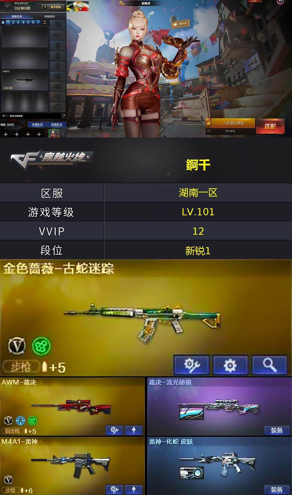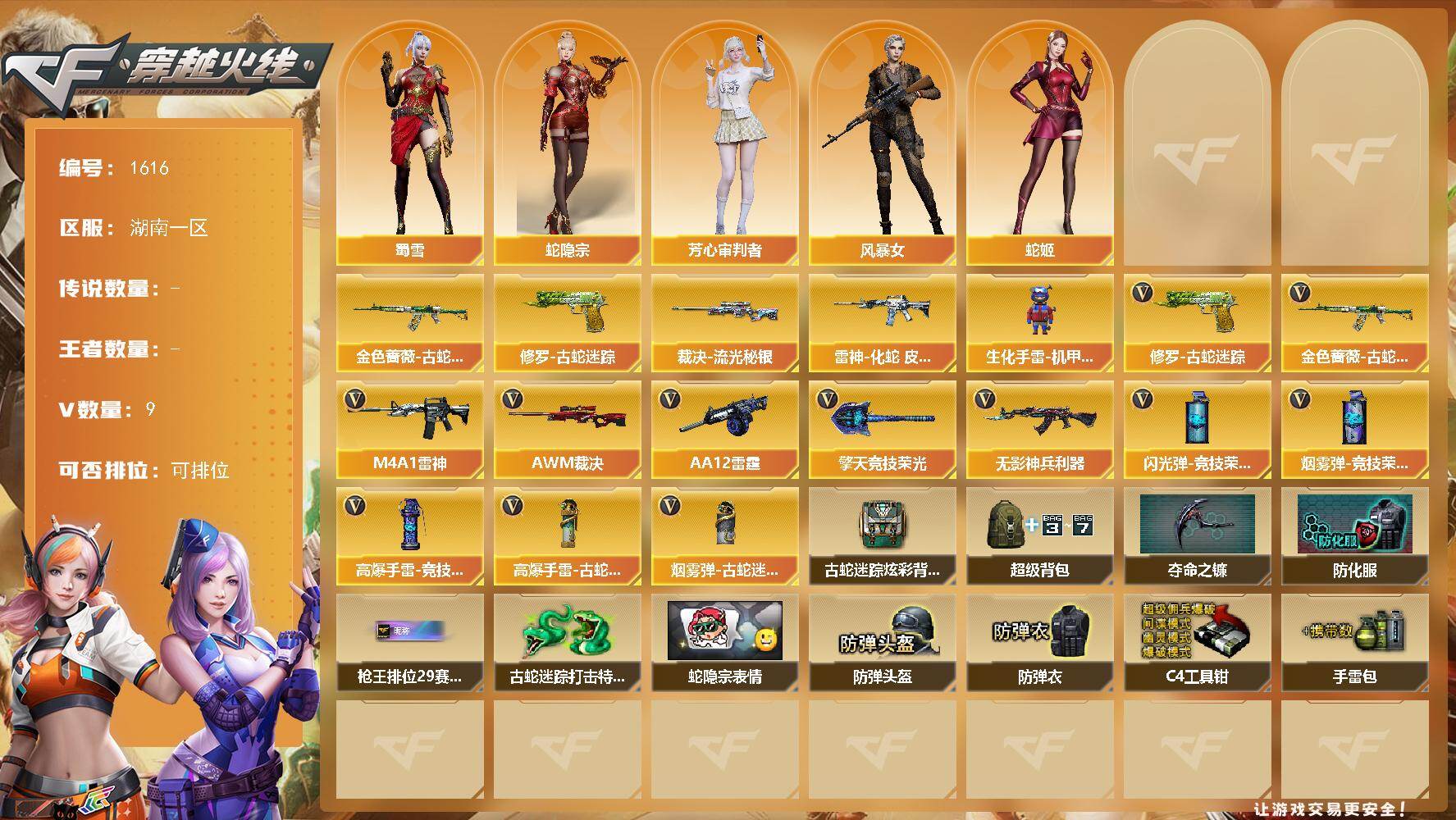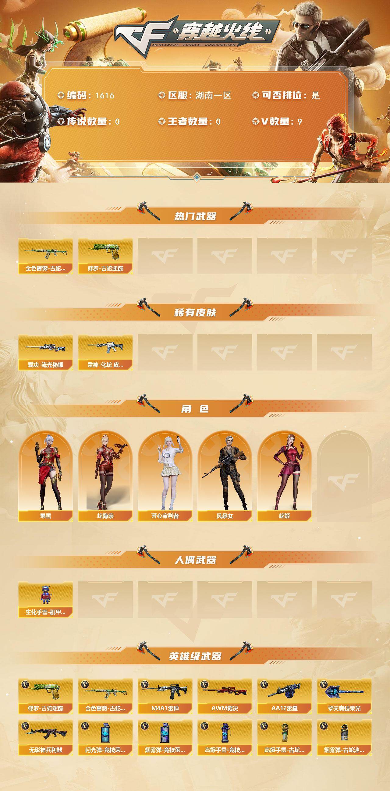 [15692039]湖南一区-9V-0王者-0炫金 【热门武器】:金色蔷薇-古蛇迷踪,修罗-古蛇迷踪 【皮肤】:裁决-流光秘银,雷神-化蛇 皮肤 【角色】:蛇隐宗,芳心审判者,风暴女,蛇姬,蜀雪 【人偶武器】:生化手雷-机甲核心 【英雄级武器】:M4A1-雷神,无影-神兵利器,金色蔷薇-古蛇迷踪,AWM-裁决,AA-12-雷霆,修罗-古蛇迷踪,擎天-竞技荣光,高爆手雷-竞技荣光,高爆手雷-古蛇迷踪,闪光弹-竞技荣光,烟雾弹-竞技荣光,烟雾弹-古蛇迷踪 【道具】:古蛇迷踪炫彩背包,超级背包,夺命之镰,防化服,枪王排位29赛季金色流光,古蛇迷踪打击特效,蛇隐宗表情,防弹头盔*2,防弹衣*2,C4工具钳*2,手雷包*2 【特殊枪械】: