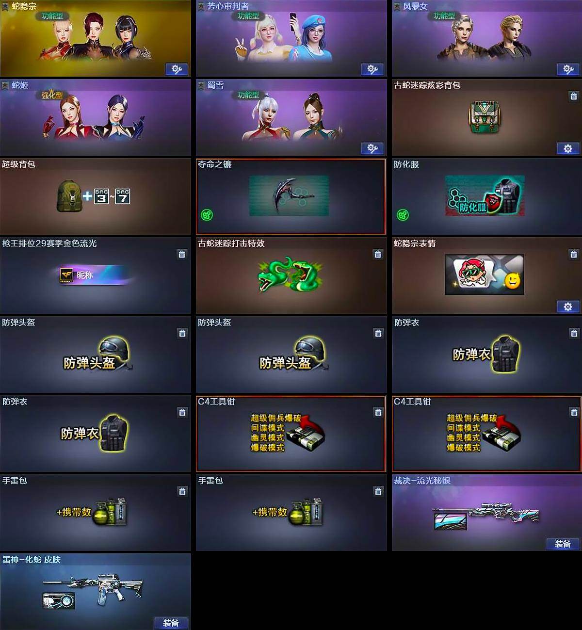 【道具】:古蛇迷踪炫彩背包,超级背包,夺命之镰,防化服,枪王排位29赛季金色流光,古蛇迷踪打击特效,蛇隐宗表情,防弹头盔*2,防弹衣*2,C4工具钳*2,手雷包*2