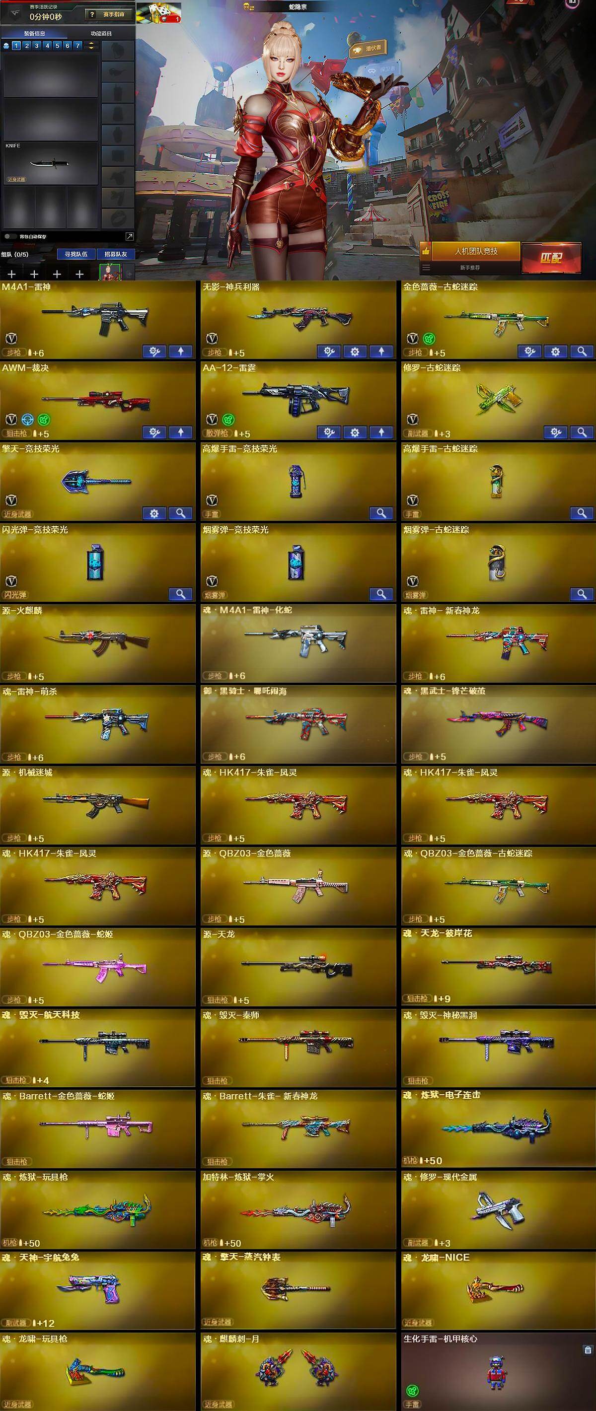 【英雄级武器】:M4A1-雷神,无影-神兵利器,金色蔷薇-古蛇迷踪,AWM-裁决,AA-12-雷霆,修罗-古蛇迷踪,擎天-竞技荣光,高爆手雷-竞技荣光,高爆手雷-古蛇迷踪,闪光弹-竞技荣光,烟雾弹-竞技荣光,烟雾弹-古蛇迷踪