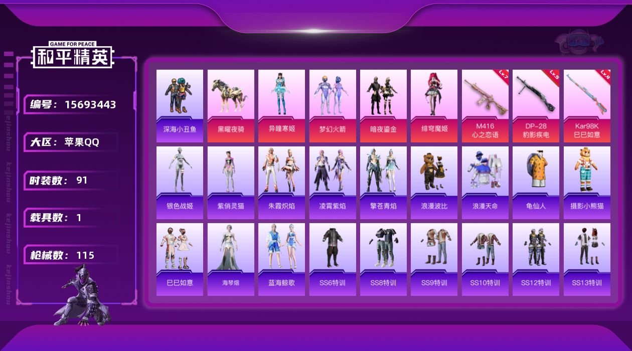 [15693443]【店主推荐捡漏号!可直接换绑】苹果 手Q-4粉装-3特效枪-1载具-2粉色飞行器-38982热力值-4王牌印记-91套装-115枪皮【热门品类】:粉装-梦幻火箭,套装-浪漫天命,套装-深海小丑鱼,套装-龟仙人,套装-浪漫波比,套装-摄影小熊猫【粉色套装】:粉装-梦幻火箭,粉装-暗夜鎏金,角色-绯穹魔姬,角色-异瞳寒姬【粉色枪皮等级】:M416-心之恋语(七级),Kar98K-巳巳如意(四级),DP-28-豹影疾电(五级)【粉色载具】:黑曜夜骑【粉色枪皮】:M416-心之恋语,Kar98K-巳巳如意,DP-28-豹影疾电【粉色飞行器】:灵猫魔法师飞行器