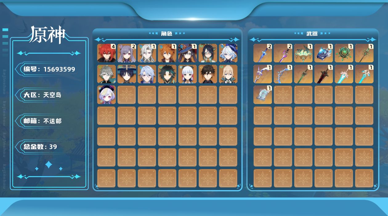 0命闲云,0命芙宁娜,1命那维莱特,0命艾尔海森,0命流浪者,0命神里绫人,0命神里绫华,0命钟离,0命魈,1命达达利亚,2命刻晴,0命七七,0命琴,1命莫娜,4命迪卢克,精1鹤鸣余音,精1万世流涌大典,精1碧落之珑,精2波乱月白经津,精1冬极白星,精2雾切之回光,精1磐岩结绿,精1四风原典,精1和璞鸢,精1阿莫斯之弓,精1天空之刃,精1狼的末路,精1天空之傲