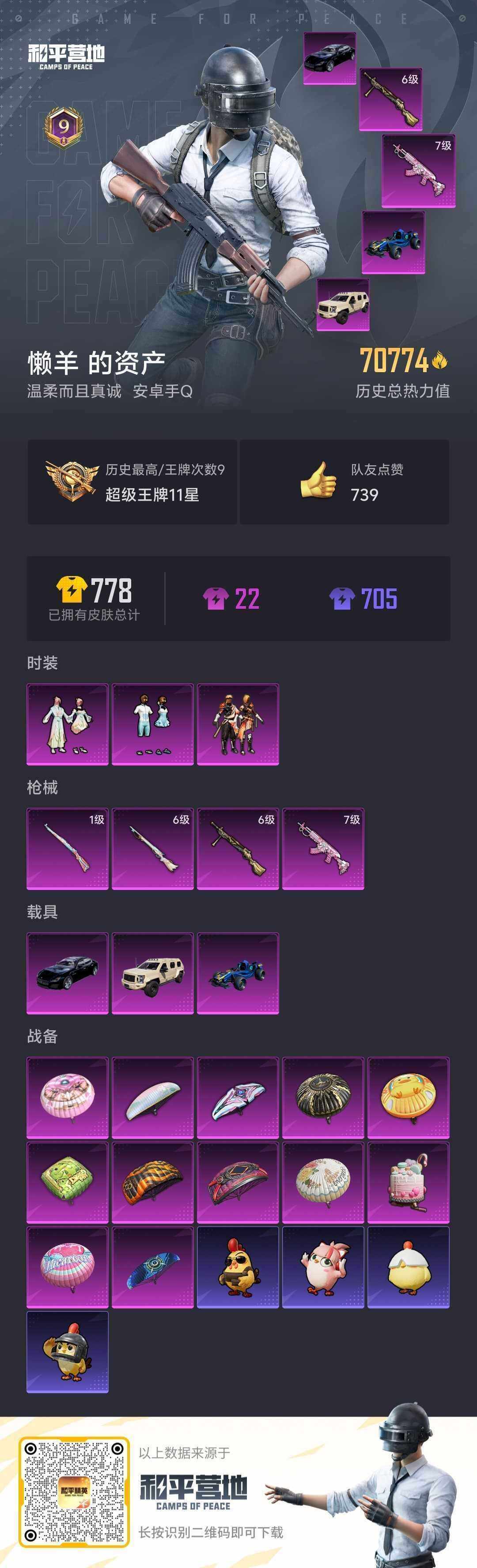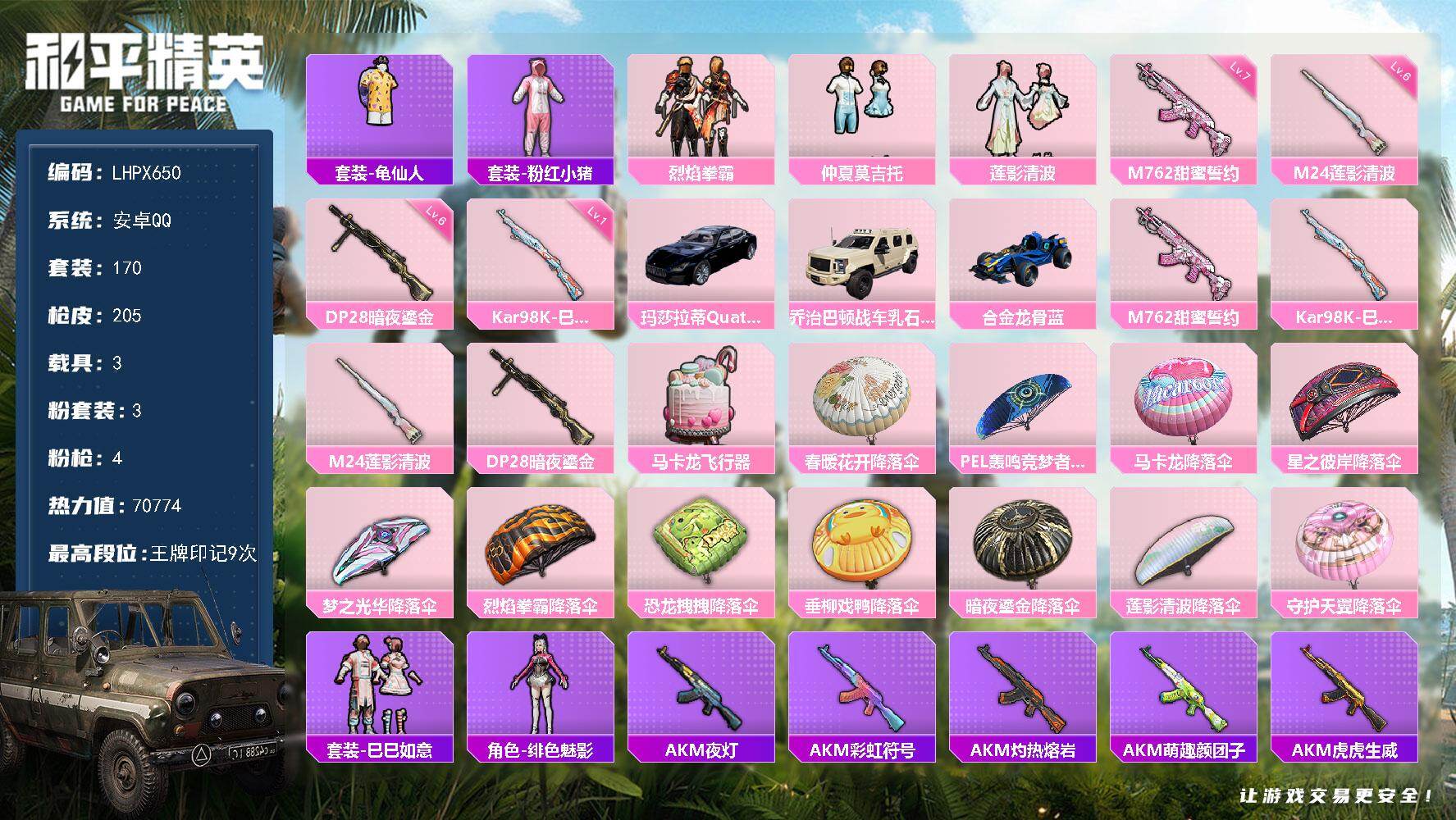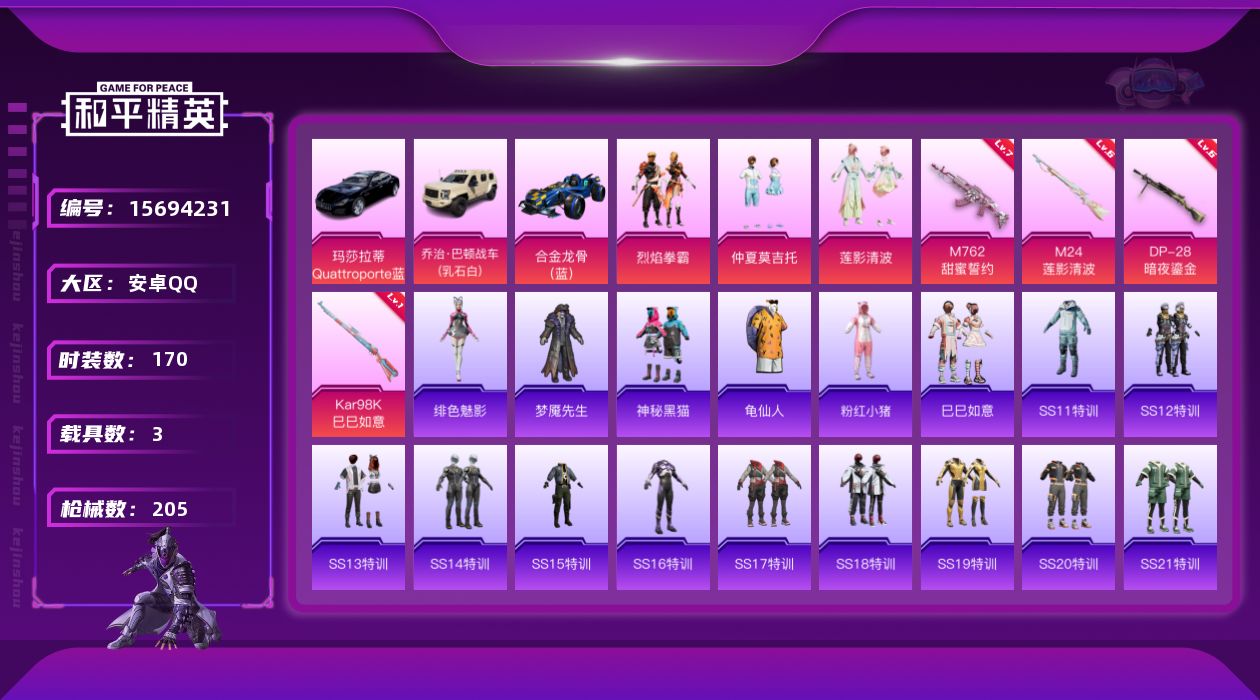 [15694231]【特价出售/店主推荐】 安卓 手Q-3粉装-4特效枪-3载具-1粉色飞行器-70774热力值-9王牌印记-170套装-205枪皮【热门品类】:套装-龟仙人,套装-粉红小猪【粉色套装】:粉装-烈焰拳霸,粉装-仲夏莫吉托,粉装-莲影清波【粉色枪皮等级】:M762-甜蜜誓约(七级),Kar98K-巳巳如意(一级),M24-莲影清波(六级),DP-28-暗夜鎏金(六级)【粉色载具】:玛莎拉蒂Quattroporte(夜幕蓝),乔治巴顿战车(乳石白),合金龙骨(蓝)【粉色枪皮】:M762-甜蜜誓约,Kar98K-巳巳如意,M24-莲影清波,DP-28-暗夜鎏金【粉色飞行器】:马卡龙飞行器