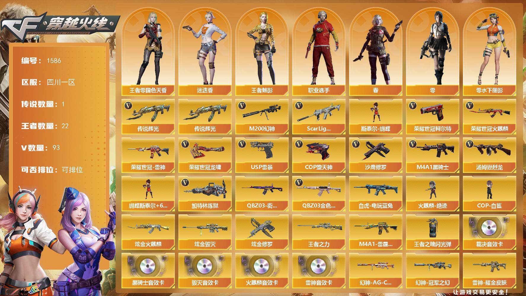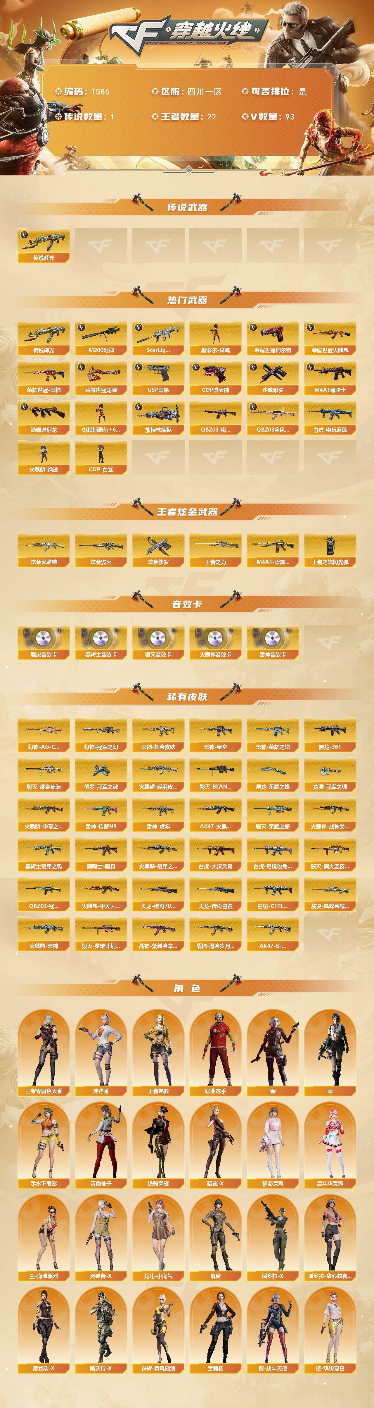 [15694537]四川一区-93V-22王者-4炫金 【传说武器】:传说辉光 【热门武器】:传说辉光,QBZ03-金色蔷薇,Scar Light-白虎,M200-幻神,荣耀世冠-火麒麟,荣耀世冠-雷神,白虎-电玩蓝兔,QBZ03-街机,荣耀世冠-柯尔特,M4A1-黑骑士,汤姆逊-烈龙*6,加特林-炼狱,斯泰尔-蝴蝶,火麒麟-绝迹,COP-白鲨*2,USP-雷暴,COP-堕天神,沙鹰-修罗*2,荣耀世冠-龙啸 【王者炫金武器】:M4A1-雷霆王者,王者之力,炫金火麒麟,炫金毁灭*2,炫金修罗,王者之魄闪光弹 【音效卡】:AK47-火麒麟音效卡,M4A1-雷神音效卡,M4A1-黑骑士音效卡,Barrett-毁灭音效卡,AWM-裁决音效卡 【皮肤】:幻神-冠军之幻,幻神-AG-CFPL S24冠军 皮肤,白虎-大汉风骨,白虎-电玩粉兔皮肤,白虎-白鲨-CFPLS23冠军,QBZ03-冠军之薇,裁决-巅峰荣耀 皮肤,雷神-荣耀之魄,雷神-星空,雷神-虎将*3,雷神-耀金皮肤*2,雷神-传奇N9,火麒麟-雷神,火麒麟-冠军之心,火麒麟-华夏之心*2,AK47-火麒麟-传奇EVEN,火麒麟-轻羽皮肤,火麒麟-战神关羽,火麒麟-平天大圣*2,毁灭-荣耀之怒,毁灭耀金皮肤,毁灭-BEAN-2020MVP,毁灭-黑大圣皮肤,毁灭-英雄计划 皮肤,M4A1-黑龙-361,黑骑士-暗月,黑骑士-冠军之势,战神-紫绶金章皮肤*3,战神-流金岁月皮肤*2,AK47-B-常胜将军-刘备,AWM-天龙-传奇70KG,AWM-天龙-传奇白鲨,修罗-冠军之魂*2,屠龙-荣耀之锋,龙啸-冠军之啸 【角色】:零,春,迷迭香,王者-零-国色天香,王者-魅影,暗夜-X,初恋灵狐,嘉年华灵狐,兰-海滩派对,零-水下丽影,灵狐者-X,龙儿-小淘气,麻雀,潘多拉-X,潘多拉-甜心教官,潜龙队-X,青霞仙子,斯沃特-X,铁骑-乘风破浪,铁骑荣耀,雪莉杨,樱-战斗天使,樱-缤纷夏日,职业选手 【人偶武器】:火麒麟-绝迹,COP-白鲨*2,火麒麟-灵狐*2,斯泰尔-蝴蝶,AWM-灵狐-15周年嘉年华,COP-旗袍*2,迷你牛牛,生化手雷-机甲核心*3,闪光弹-小乔,迷你超能女侍 【挑战大师】:神圣爆裂者III,激光毁灭者III-白马银枪 【英雄级武器】:AK47-火麒麟,M4A1-雷神*2,M4A1-黑骑士,AK47-黑鲨,M4A1-