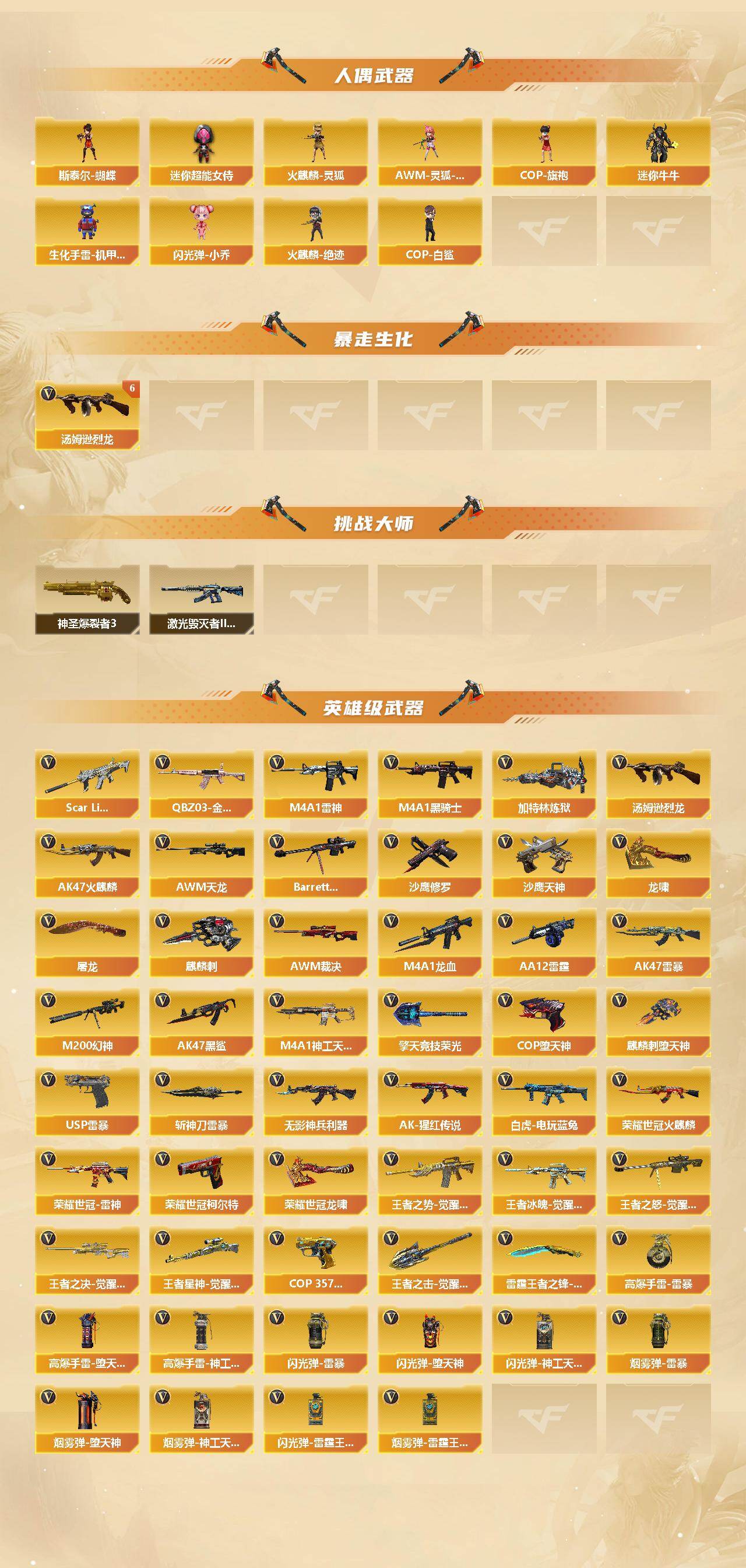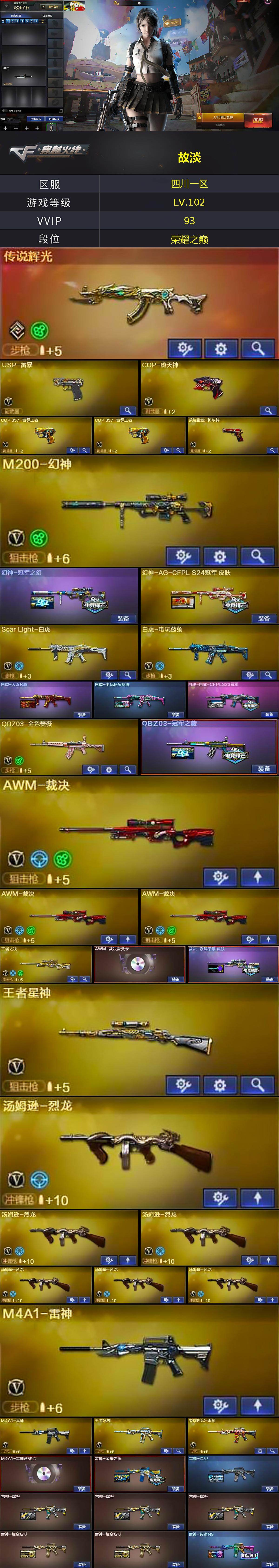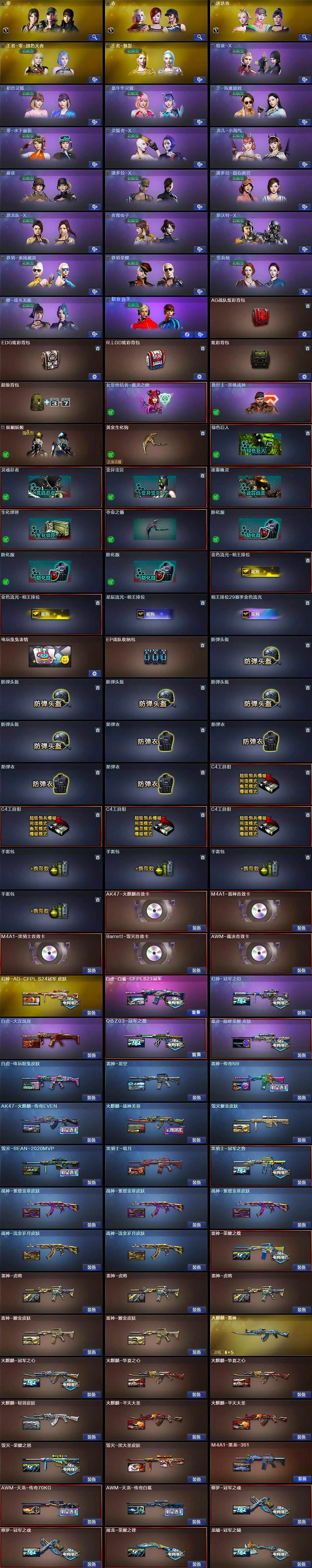 【皮肤】:幻神-冠军之幻,幻神-AG-CFPL S24冠军 皮肤,白虎-大汉风骨,白虎-电玩粉兔皮肤,白虎-白鲨-CFPLS23冠军,QBZ03-冠军之薇,裁决-巅峰荣耀 皮肤,雷神-荣耀之魄,雷神-星空,雷神-虎将*3,雷神-耀金皮肤*2,雷神-传奇N9,火麒麟-雷神,火麒麟-冠军之心,火麒麟-华夏之心*2,AK47-火麒麟-传奇EVEN,火麒麟-轻羽皮肤,火麒麟-战神关羽,火麒麟-平天大圣*2,毁灭-荣耀之怒,毁灭耀金皮肤,毁灭-BEAN-2020MVP,毁灭-黑大圣皮肤,毁灭-英雄计划 皮肤,M4A1-黑龙-361,黑骑士-暗月,黑骑士-冠军之势,战神-紫绶金章皮肤*3,战神-流金岁月皮肤*2,AK47-B-常胜将军-刘备,AWM-天龙-传奇70KG,AWM-天龙-传奇白鲨,修罗-冠军之魂*2,屠龙-荣耀之锋,龙啸-冠军之啸