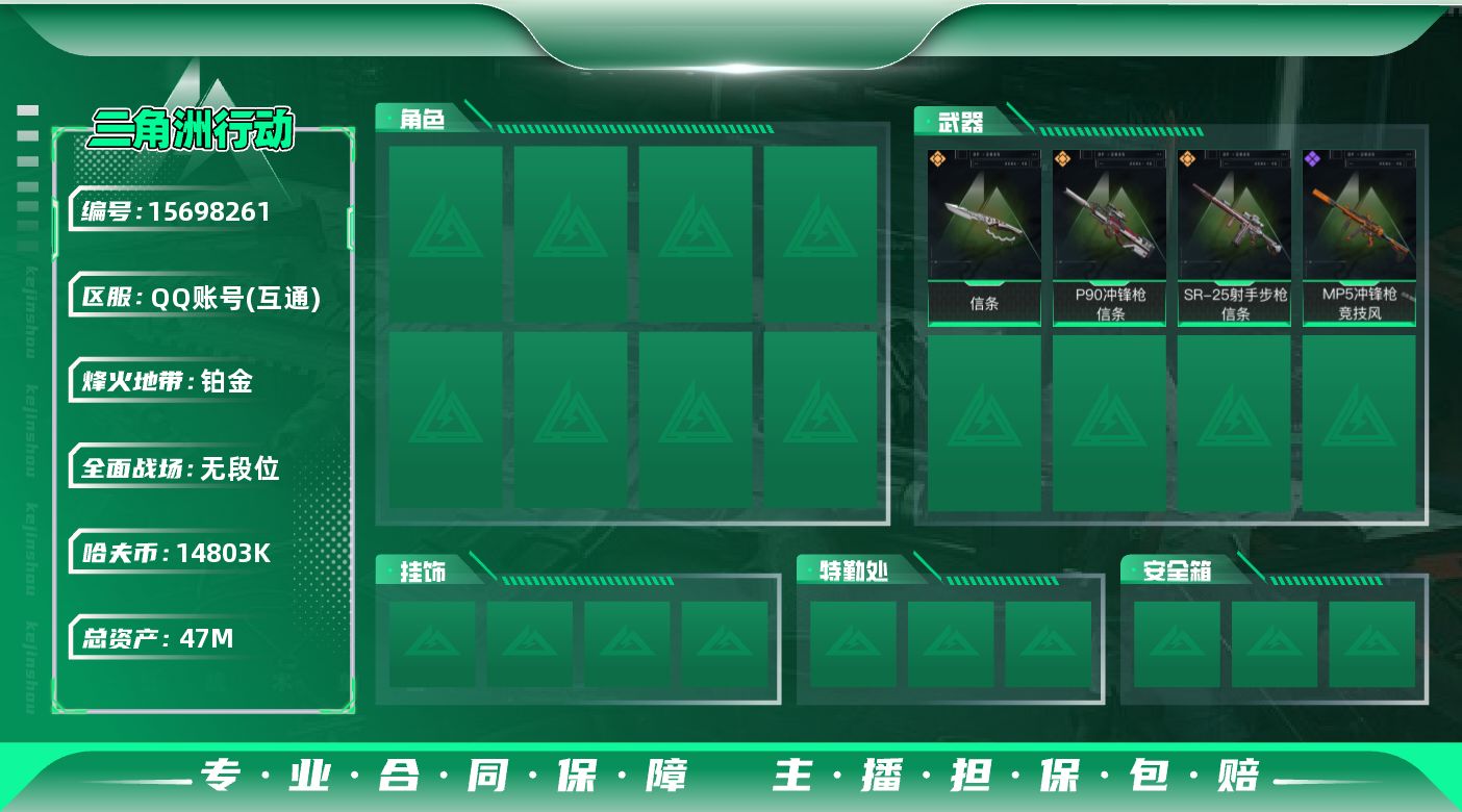 [15698261]47m总资产-14803k哈伏币-40烽火等级-铂金-1战场等级-无军衔 【近战皮肤】:近战-信条,近战-黑鹰 【传说外观】:P90冲锋枪-信条,SR-25射手步枪-信条 【史诗外观】:MP5冲锋枪-竞技风 【稀有外观】:AKM突击步枪-肃杀 【普通外观】:QBZ95-1突击步枪-三角洲力量,QBZ95-1突击步枪-海色,Vector冲锋枪-几何迷彩,M1014霰弹枪-高雅黑,M1014霰弹枪-海浪,SKS射手步枪-三角洲力量 【军牌】:军牌-信誉优秀