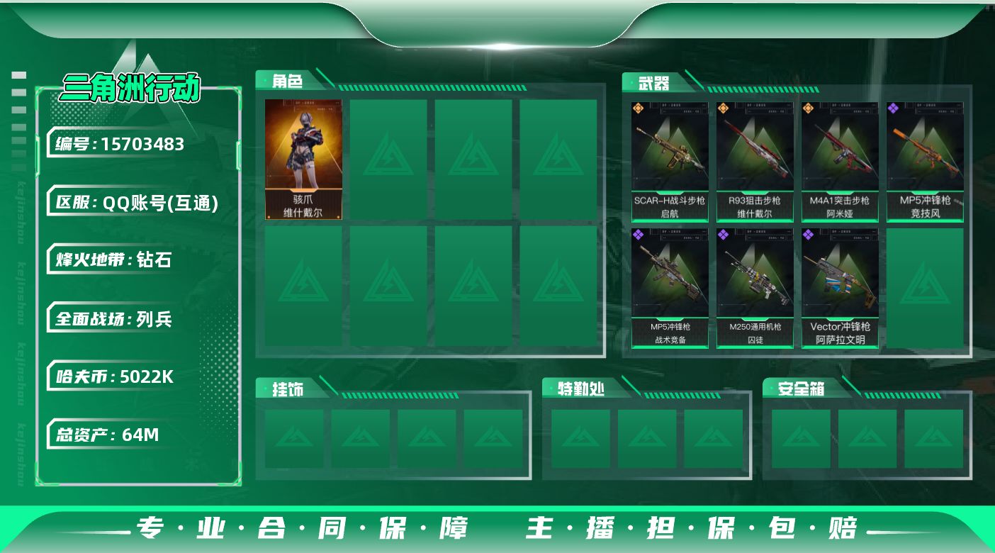 [15703483]64m总资产-5022k哈伏币-58烽火等级-钻石-15战场等级-列兵 【干员外观】:骇爪-维什戴尔 【近战皮肤】:近战-黑鹰 【传说外观】:M4A1突击步枪-阿米娅,SCAR-H战斗步枪-启航,R93狙击步枪-维什戴尔 【史诗外观】:MP5冲锋枪-战术竞备,MP5冲锋枪-竞技风,Vector冲锋枪-阿萨拉文明,M250通用机枪-囚徒 【稀有外观】:AKM突击步枪-肃杀,M7战斗步枪-捣蛋鬼,SCAR-H战斗步枪-荣耀列队,K437突击步枪-生存指令,MK47突击步枪-精英联盟,MP5冲锋枪-哈夫克卫队,SMG-45-行动开启,勇士冲锋枪-冰天雪地,QJB201轻机枪-哈夫克卫队,Mini-14射手步枪-荣耀列队,SR-25射手步枪-开拓,G18-星链科技,G18-哈夫克航天 【普通外观】:M4A1突击步枪-粉色涂装,QBZ95-1突击步枪-高雅黑,QBZ95-1突击步枪-海浪,K416突击步枪-几何迷彩,K416突击步枪-高雅黑,M16A4突击步枪-高雅黑,AUG突击步枪-浅蓝涂装,M7战斗步枪-红色涂装,SG552突击步枪-海浪,G3战斗步枪-高雅黑,MP5冲锋枪-海色,MP5冲锋枪-黄蜂,Vector冲锋枪-几何迷彩,UZI冲锋枪-海色,M1014霰弹枪-海浪,M250通用机枪-条纹,SR-25射手步枪-黄蜂,SV-98狙击步枪-红色涂装,QSZ92G-条纹,沙漠之鹰-海浪,沙漠之鹰-高雅黑 【载具外观】:轮式突击炮-荣耀 【军牌】:军牌-装备修理,军牌-静谧时光,军牌-来点薯条,军牌-修整,军牌-神秘艺术,军牌-信誉优秀,军牌-小心鳄鱼 【挂饰】:挂饰-维什戴尔,挂饰-蚀金玫瑰,挂饰-阿萨拉狙击兵,挂饰-阿萨拉霰弹兵,挂饰-诡影狙击兵,挂饰-诡影喷火兵*2,挂饰-崩岩重炮*2,挂饰-暗行哨兵,挂饰-启程,挂饰-阿萨拉徽章