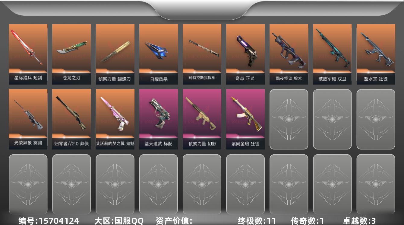 [15704124]【英雄】:幻棱,炼狱,维斯,暮蝶,钛狐,壹决,铁臂,捷风,雷兹,幽影,不死鸟,贤者,猎枭,零,芮娜,奇乐,尚勃勒,霓虹,斯凯,夜露,星礈,K/O,海神,盖可,黑梦,钢锁 【近战武器】:近战武器-5周年//公测重制版 苍龙之刃,近战武器-侦察力量 蝴蝶刀,近战武器-日耀风暴 遗器,近战武器-阿特拉斯指挥部 甩棍,近战武器-星际猎兵 短剑 【狂徒】:狂徒-塑水宗,狂徒-紫阙金琅 【幻影】:幻影-侦察力量 【戍卫】:戍卫-破败军械 【獠犬】:獠犬-黯夜怪谈 【冥驹】:冥驹-光荣异象 【莽侠】:莽侠-归零者//2.0 【骇灵】:骇灵-无限竞技 【标配】:标配-堕天遗武 【正义】:正义-奇点 【鬼魅】:鬼魅-艾沃莉的梦之翼 【卡面】:精灵大战 卡面,南瓜盛典 卡面,树懒大作战 卡面,Clutch 卡面,无畏契约GO!第一卷:芮娜 卡面,无畏契约GO!第一卷:零 卡面,《双城之战》金克丝 卡面,钢锁vs盖可 卡面,别冒尖 卡面,代号红色 卡面,新兵报到 卡面,V契约 卡面,无畏契约 卡面 【喷漆】:战“素”兔 喷漆,控场勿近 喷漆,审判之爪 喷漆,霓光四射 喷漆,买装还是存钱 喷漆,酷熊冲浪 喷漆,无畏契约GO!第一卷:贤者 喷漆,放下武器 喷漆,胜利属于无畏契约 喷漆,GLHF 喷漆,无畏契约 喷漆 【挂饰】:伞绳 挂饰,第九季//第三幕 纪念币 挂饰,无畏契约GO!第一卷 芮娜 挂饰,无畏契约GO!第一卷 零 挂饰,薰衣草之心 挂饰,Z世代特饮 挂饰,天外飞客 挂饰,海豹的认可 挂饰,无畏契约 纪念币 挂饰