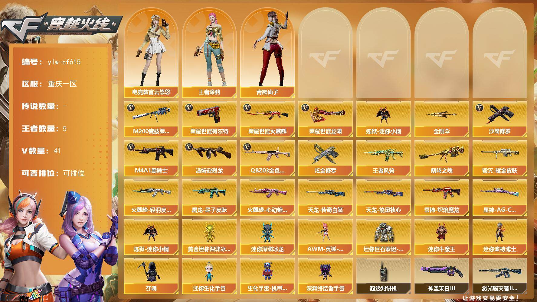 [15705913]重庆一区-41V-5王者-1炫金 【热门武器】:QBZ03-金色蔷薇,M200-竞技荣光,荣耀世冠-火麒麟,荣耀世冠-柯尔特,炼狱-迷你小钢,M4A1-黑骑士,汤姆逊-烈龙*2,沙鹰-修罗,荣耀世冠-龙啸,金刚伞 【王者炫金武器】:炫金修罗,王者风势,凰鸣之魄 【稀有皮肤】:Kar98K-星神-AG-CFPLS21冠军皮肤,雷神-炽焰魔龙,火麒麟-轻羽皮肤,火麒麟-心动糖果,黑龙-墨子皮肤,毁灭耀金皮肤,天龙-能量核心,AWM-天龙-传奇白鲨 【角色】:王者涂鸦,电竞教官-云悠悠,青霞仙子 【人偶武器】:AWM-灵狐-15周年嘉年华,炼狱-迷你小钢,黄金迷你深渊冰龙,迷你深渊冰龙,迷你巨石泰坦-魔花研究所,迷你牛魔王,迷你波特博士,夺魂*2,迷你生化手雷,生化手雷-机甲核心,深渊终结者手雷 【暴走生化】:炼狱-迷你小钢,超级对讲机 【挑战大师】:神圣爆裂者-末日III,激光毁灭者III,激光毁灭者III-白马银枪*3,冰龙粉碎者-白马银枪 【英雄级武器】:M200-竞技荣光,擎天-竞技荣光*2,高爆手雷-竞技荣光*2,烟雾弹-竞技荣光*3,闪光弹-竞技荣光*2,荣耀世冠-火麒麟,荣耀世冠-柯尔特,荣耀世冠-龙啸,天神-动感闪耀,手雷-动感闪耀,QBZ03-金色蔷薇,无影-神兵利器,M4A1-雷神,M4A1-黑龙,M4A1-黑骑士,M4A1-死神,汤姆逊-烈龙*2,AK47-火麒麟,AK47-黑武士,AWM-天龙,Barrett-毁灭,AWM-裁决,QBZ03-天罚,AK47-黑鲨*2,M4A1-猎神,黑武士-锦绣游龙,沙鹰-天神*3,沙鹰-修罗,擎天,龙啸,屠龙 【特殊枪械】:1黑骑士,2烈龙