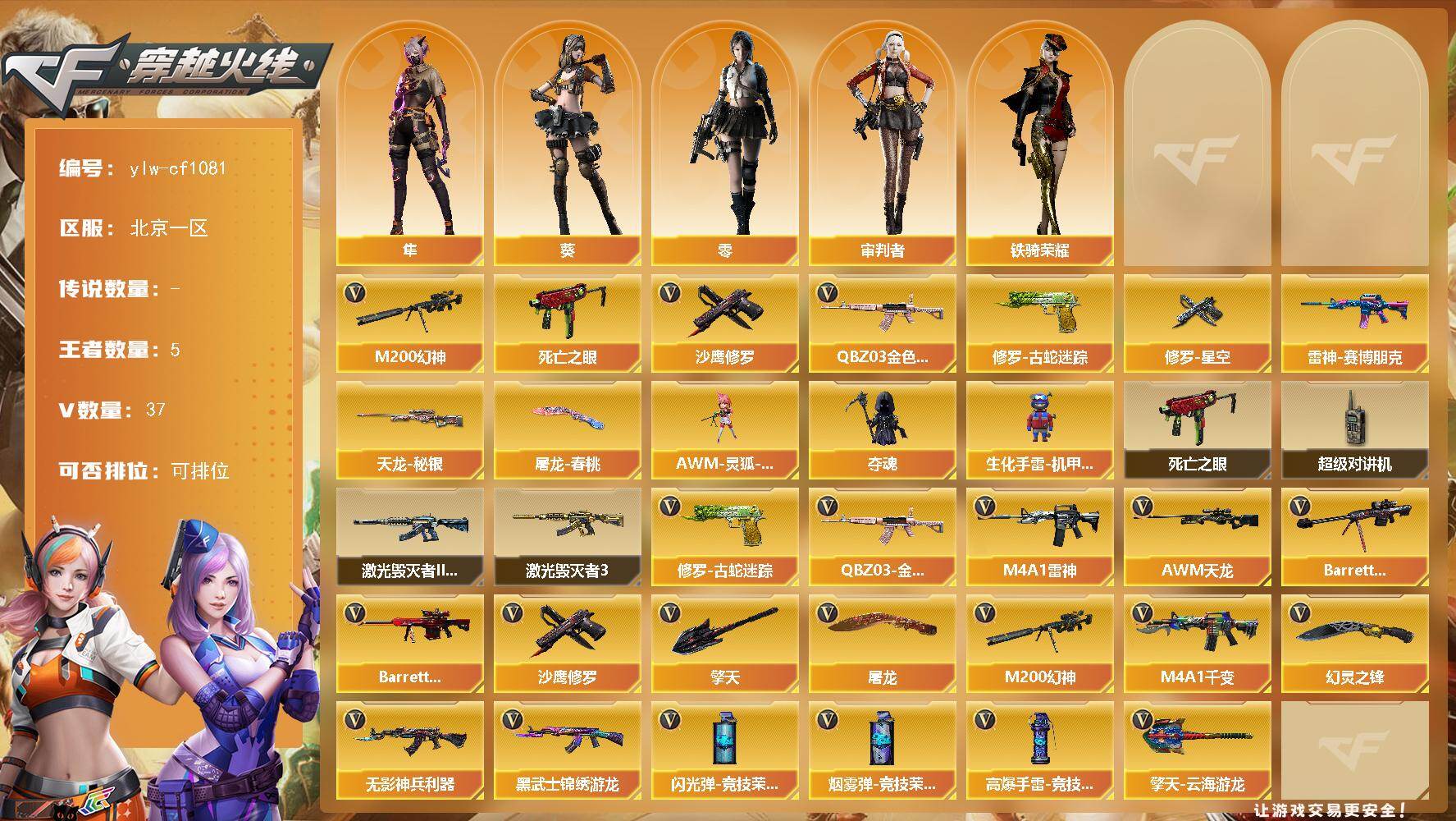 [15707142]北京一区-37V-5王者-0炫金 【热门武器】:QBZ03-金色蔷薇,M200-幻神,修罗-古蛇迷踪,死亡之眼,沙鹰-修罗*3 【稀有皮肤】:雷神-赛博朋克,天龙-秘银,M200-庆典-CFS 2021*2,修罗-星空,屠龙-春桃 皮肤 【角色】:零,葵,隼,审判者,铁骑荣耀 【人偶武器】:AWM-灵狐-15周年嘉年华,夺魂,生化手雷-机甲核心 【暴走生化】:死亡之眼,超级对讲机 【挑战大师】:激光毁灭者III*3,激光毁灭者III-白马银枪 【英雄级武器】:高爆手雷-竞技荣光,烟雾弹-竞技荣光,闪光弹-竞技荣光*3,幻灵之锋,QBZ03-金色蔷薇,无影-神兵利器,M4A1-雷神,AWM-天龙,Barrett-毁灭,Barrett-极光,M200-幻神,M4A1-千变,黑武士-锦绣游龙,修罗-古蛇迷踪,沙鹰-修罗*3,擎天,屠龙,擎天-云海游龙