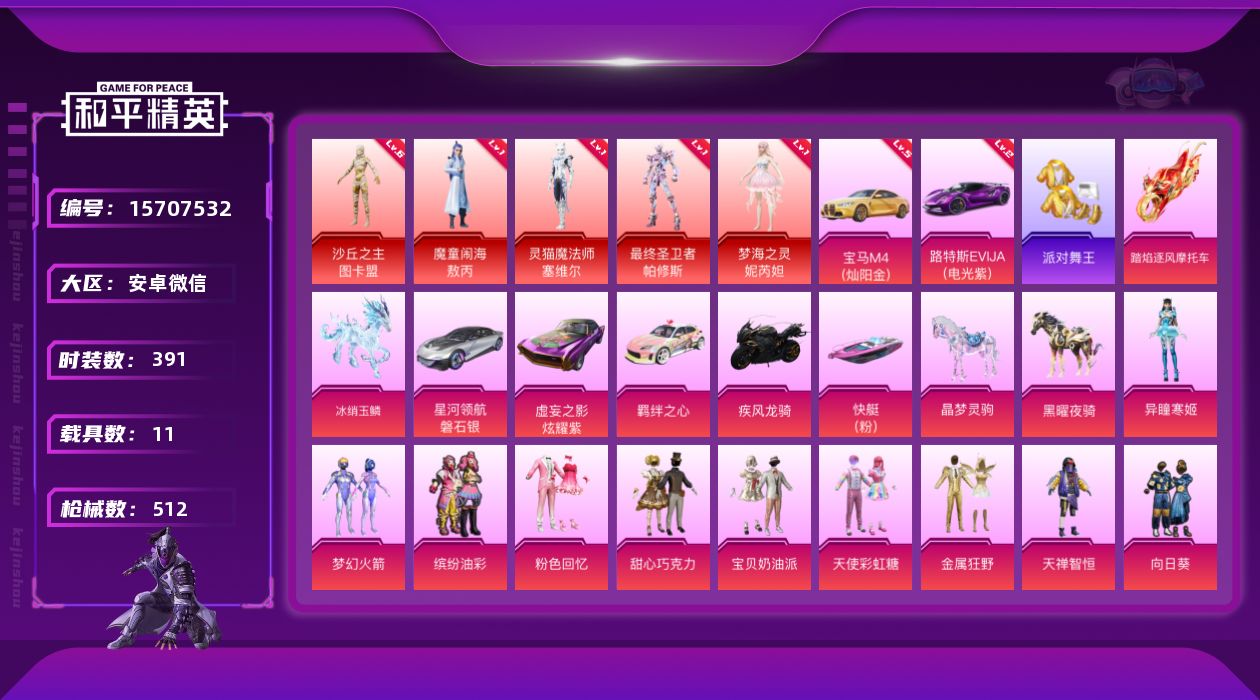 - [16142728]【特价出售/店主推荐】安卓 手Q-14粉装-8特效枪-4载具-6粉色飞行器-62008热力值-7王牌印记-121套装-181枪皮【热门品类】:粉装-梦幻火箭【粉色套装】:粉装-梦幻火箭,粉装-傲雪凌霜,粉装-霁雪冰心,粉装-冰川幽秘,粉装-霞光圣骑,粉装-金丰海韵,角色-千金淑猫,角色-晶梦幻蝶,粉装-雪月幻音,粉装-星穹咏叹调,角色-时光之吻,角色-奇迹舞步 美琪,角色-冰魄,角色-羊梦糖心【粉色枪皮等级】:GROZA-镜光银凌(五级),Kar98K-巳巳如意(五级),Kar98K-圣域龙灵(三级),AWM-天使羽翼(六级),AMR-智耀战神(五级),DP-28-千金淑猫(七级),DP-28-豹影疾电(五级),MG3-辉羽雀灵(三级)【粉色载具】:仰望U9(赤霞丹朱),宝马M4(圣保罗黄),保时捷Cayenne(激情红),晶梦灵驹【粉色枪皮】:GROZA-镜光银凌,Kar98K-巳巳如意,Kar98K-圣域龙灵,AWM-天使羽翼,AMR-智耀战神,DP-28-千金淑猫,DP-28-豹影疾电,MG3-辉羽雀灵【粉色飞行器】:幽焰列车飞行器,晶梦幻蝶飞行器,圣域金龙飞行器,雀灵庇佑飞行器,暮色之舞飞行器