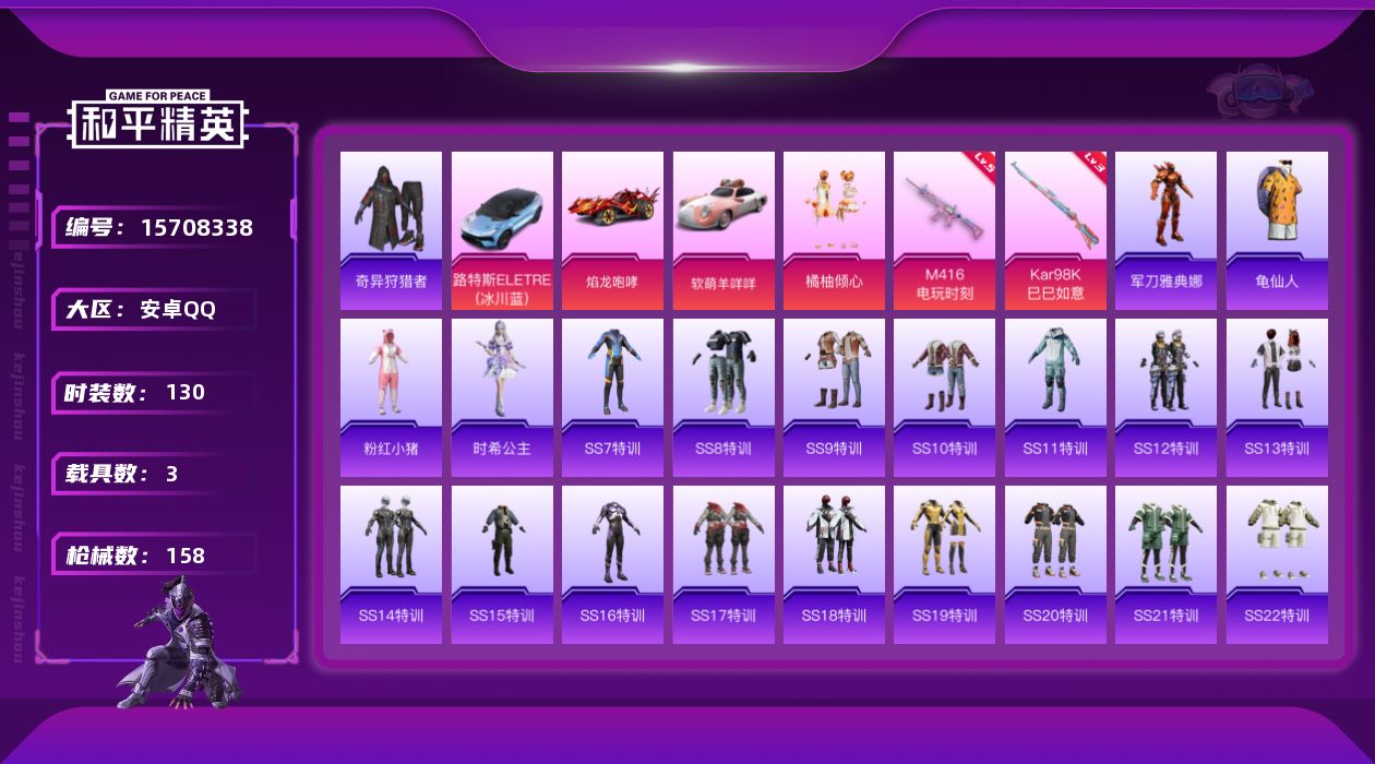 - PX_2096508- 苹果手Q-13王牌印记-10粉装-9特效枪-4载具-84289热力值-179套装-259枪皮-4卓越印记-1传奇印记 【10粉装】,幻彩电音,绯月迷踪,星穹咏叹调,罗征,雪月幻音,千金淑猫,蜜语绒猫,圣堂之誓,烟云彩露,美琪 【9特效枪】M16A4-垂柳戏鸭-3级 M416-电玩时刻-5级 M416-风花雪月-4级 Kar98K-巳巳如意-5级 Kar98K-圣域龙灵-3级