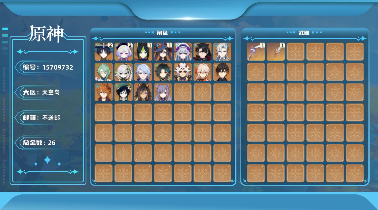 0命莱欧斯利,0命那维莱特,0命白术,0命迪希雅,2命流浪者,0命纳西妲,1命提纳里,0命神里绫人,0命荒泷一斗,0命枫原万叶,0命钟离,0命魈,0命温迪,0命达达利亚,0命刻晴,2命七七,1命莫娜,0命梦见月瑞希,精1天空之脊,精1阿莫斯之弓