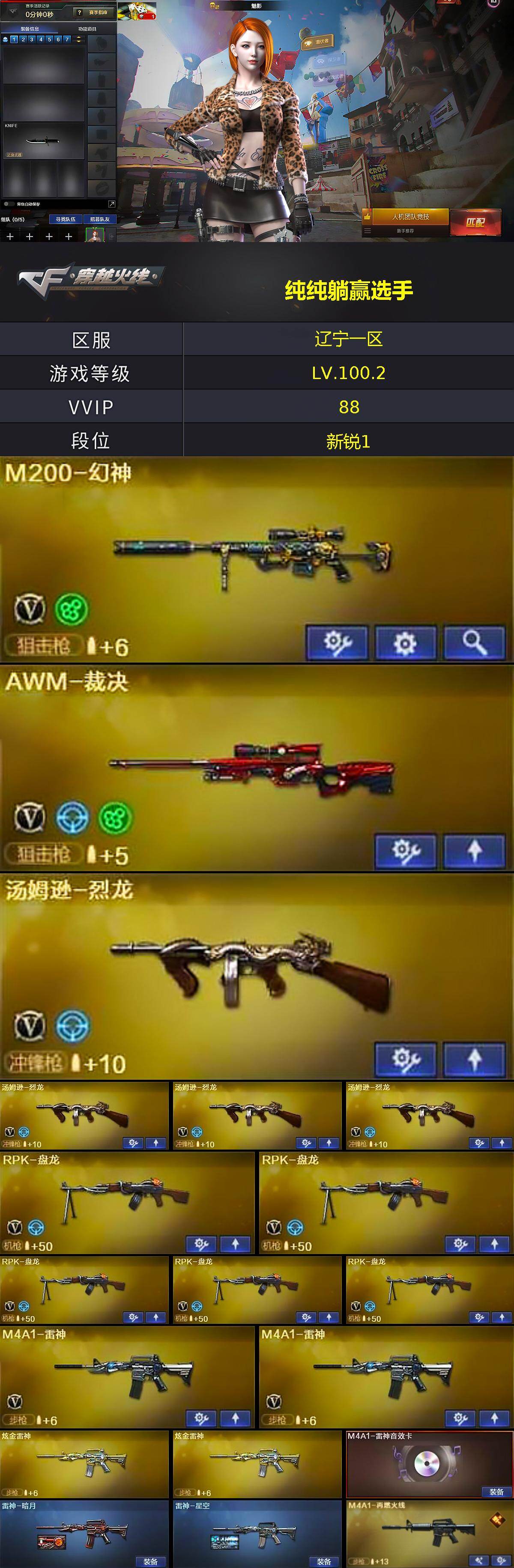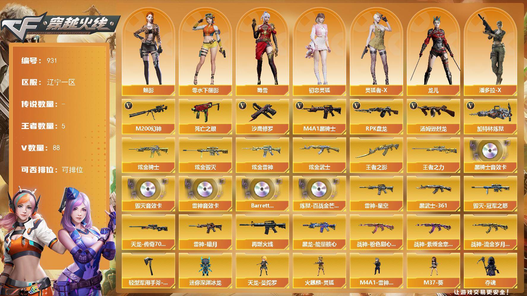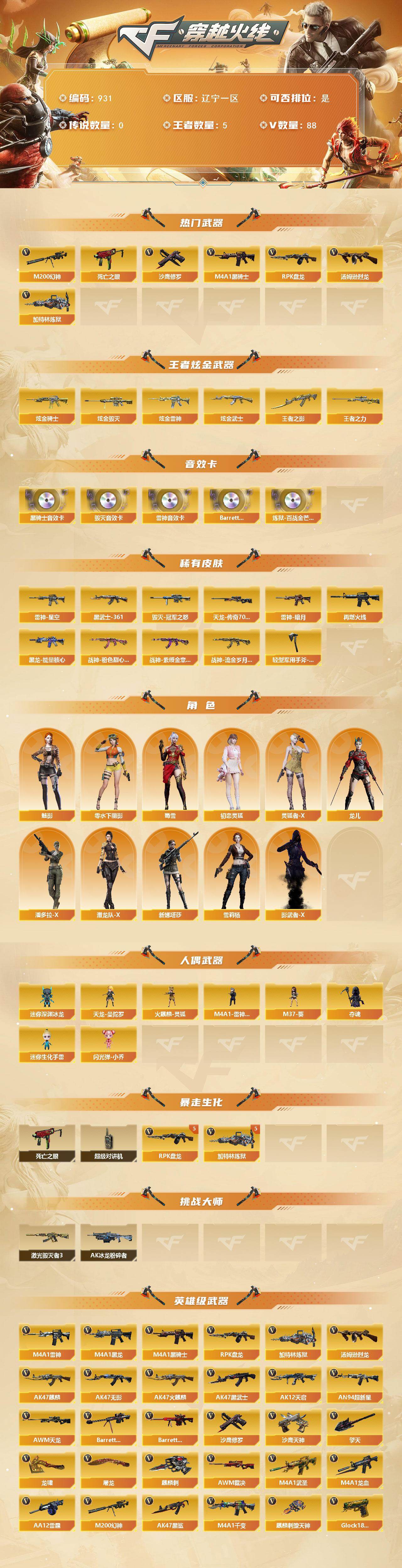 [15713442]辽宁一区-88V-5王者-6炫金 【热门武器】:M200-幻神,死亡之眼,M4A1-黑骑士*4,汤姆逊-烈龙*4,RPK-盘龙*5,加特林-炼狱*5,沙鹰-修罗*5 【王者炫金武器】:王者之影,王者之力,炫金骑士,炫金雷神*2,炫金武士,炫金毁灭*2 【音效卡】:M4A1-雷神音效卡,M4A1-黑骑士音效卡,Barrett-毁灭音效卡,Barrett-碧霄极光音效卡,炼狱-百战金芒-庆典舞曲音效卡 【皮肤】:雷神-暗月,雷神-星空,M4A1-再燃火线,毁灭-冠军之怒,黑龙-能量核心,AK47-黑武士-361,战神-粉色甜心皮肤*2,战神-紫绶金章皮肤*2,战神-流金岁月皮肤*3,AWM-天龙-传奇70KG,轻型军用手斧-再燃火线 【角色】:魅影,初恋灵狐,零-水下丽影,灵狐者-X,龙儿,潘多拉-X,潜龙队-X,蜀雪,新娜塔莎,雪莉杨,影武者-X 【人偶武器】:天龙-曼陀罗,火麒麟-灵狐*2,M4A1-雷神-精英刀锋,M37-葵,迷你深渊冰龙*3,夺魂,迷你生化手雷,闪光弹-小乔 【暴走生化】:死亡之眼,超级对讲机 【挑战大师】:AK47-冰龙粉碎者*2,激光毁灭者III 【英雄级武器】:M4A1-千变,AK47-火麒麟*3,AK47-麒麟,M4A1-黑龙*2,M4A1-雷神*2,M4A1-黑骑士*4,AK47-无影,AK47-黑武士,AK12-天启,AN94-超新星,M4A1-武圣*3,AK47-黑鲨,M4A1-龙血*5,王者之幻-觉醒版,AK-47-猩红传说*6,AK47-B-战神,AWM-天龙,Barrett-毁灭,Barrett-极光*2,AWM-裁决,M200-幻神,RPK-盘龙*5,加特林-炼狱*5,炼狱-百战金芒,汤姆逊-烈龙*4,AA-12-雷霆*2,沙鹰-修罗*5,沙鹰-天神,Glock18-武圣,屠龙*4,龙啸,麒麟刺-堕天神,擎天,麒麟刺*3,麒麟刺-百战金芒,王者之击-觉醒版*2,高爆手雷-雷霆,高爆手雷-堕天神,闪光弹-雷霆,闪光弹-堕天神,烟雾弹-雷霆,烟雾弹-堕天神 【道具】:炫彩背包,百战金芒炫彩背包,超级背包,女皇终结者-魔龙之吻,绿色巨人,灵魂忍者*2,变异宝贝,妖姬,迷雾幽灵,生化弹匣,夺命之镰,防化服*2,流光-鎏金之域,枪王排位29赛季金色流光,语音特效-盛典烟火,萌萌小葵表情,防弹头盔*5,防弹衣*7,C4工具钳*4,手雷