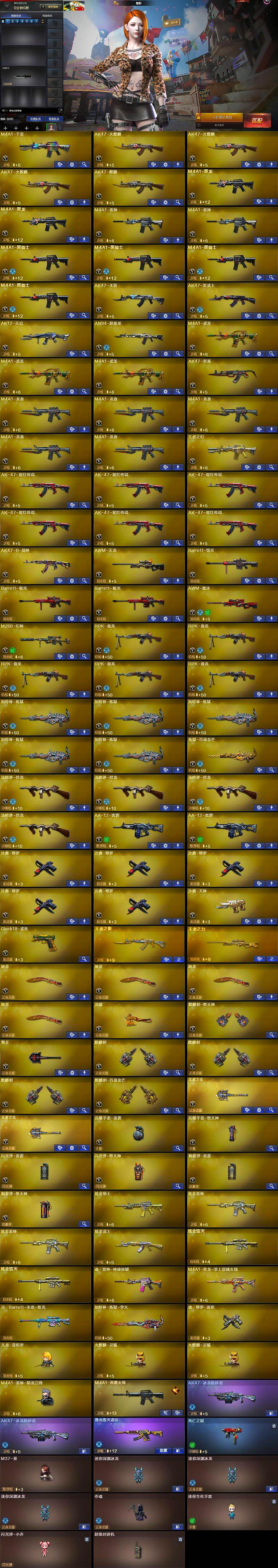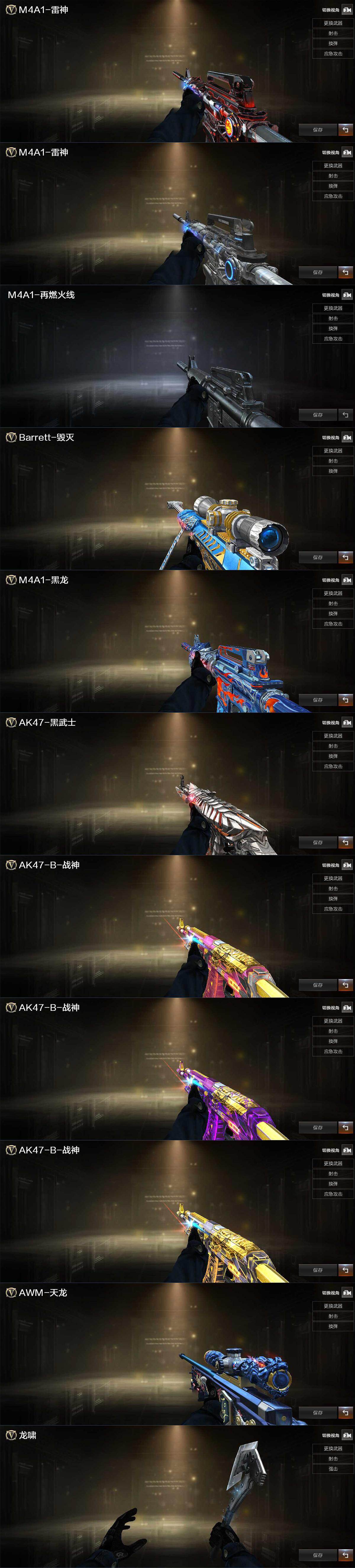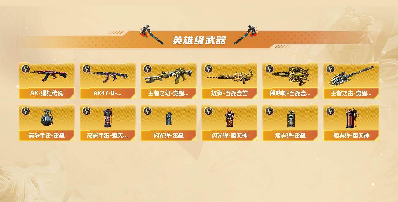 【英雄级武器】:M4A1-千变,AK47-火麒麟*3,AK47-麒麟,M4A1-黑龙*2,M4A1-雷神*2,M4A1-黑骑士*4,AK47-无影,AK47-黑武士,AK12-天启,AN94-超新星,M4A1-武圣*3,AK47-黑鲨,M4A1-龙血*5,王者之幻-觉醒版,AK-47-猩红传说*6,AK47-B-战神,AWM-天龙,Barrett-毁灭,Barrett-极光*2,AWM-裁决,M200-幻神,RPK-盘龙*5,加特林-炼狱*5,炼狱-百战金芒,汤姆逊-烈龙*4,AA-12-雷霆*2,沙鹰-修罗*5,沙鹰-天神,Glock18-武圣,屠龙*4,龙啸,麒麟刺-堕天神,擎天,麒麟刺*3,麒麟刺-百战金芒,王者之击-觉醒版*2,高爆手雷-雷霆,高爆手雷-堕天神,闪光弹-雷霆,闪光弹-堕天神,烟雾弹-雷霆,烟雾弹-堕天神