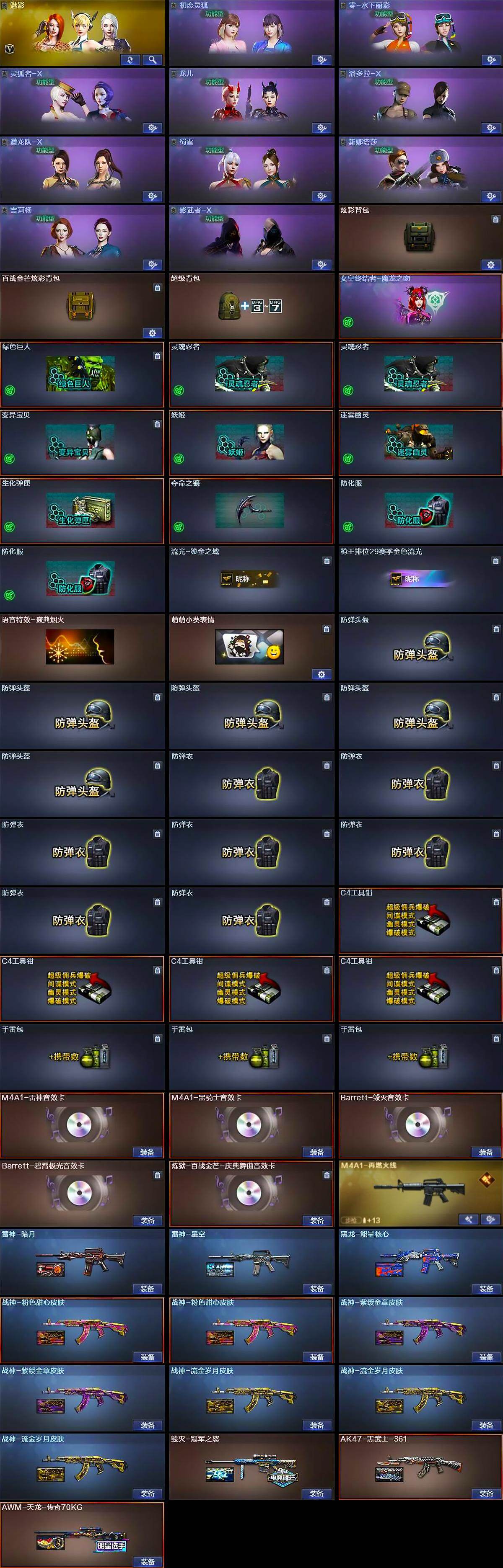 【皮肤】:雷神-暗月,雷神-星空,M4A1-再燃火线,毁灭-冠军之怒,黑龙-能量核心,AK47-黑武士-361,战神-粉色甜心皮肤*2,战神-紫绶金章皮肤*2,战神-流金岁月皮肤*3,AWM-天龙-传奇70KG,轻型军用手斧-再燃火线