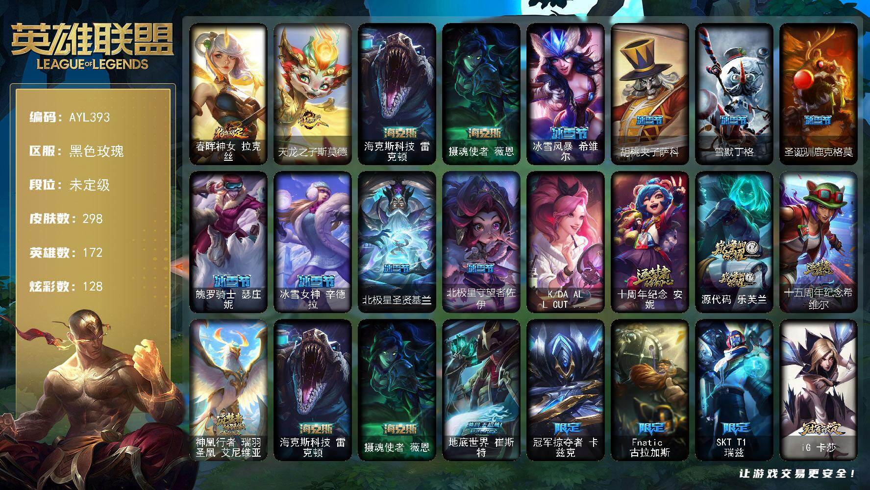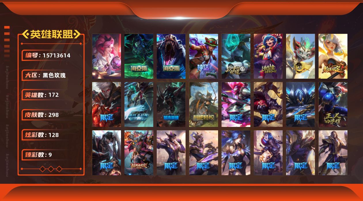 未定级段位-172英雄-298皮肤-128炫彩-3终极-6神话-38限定-45传说-80史诗