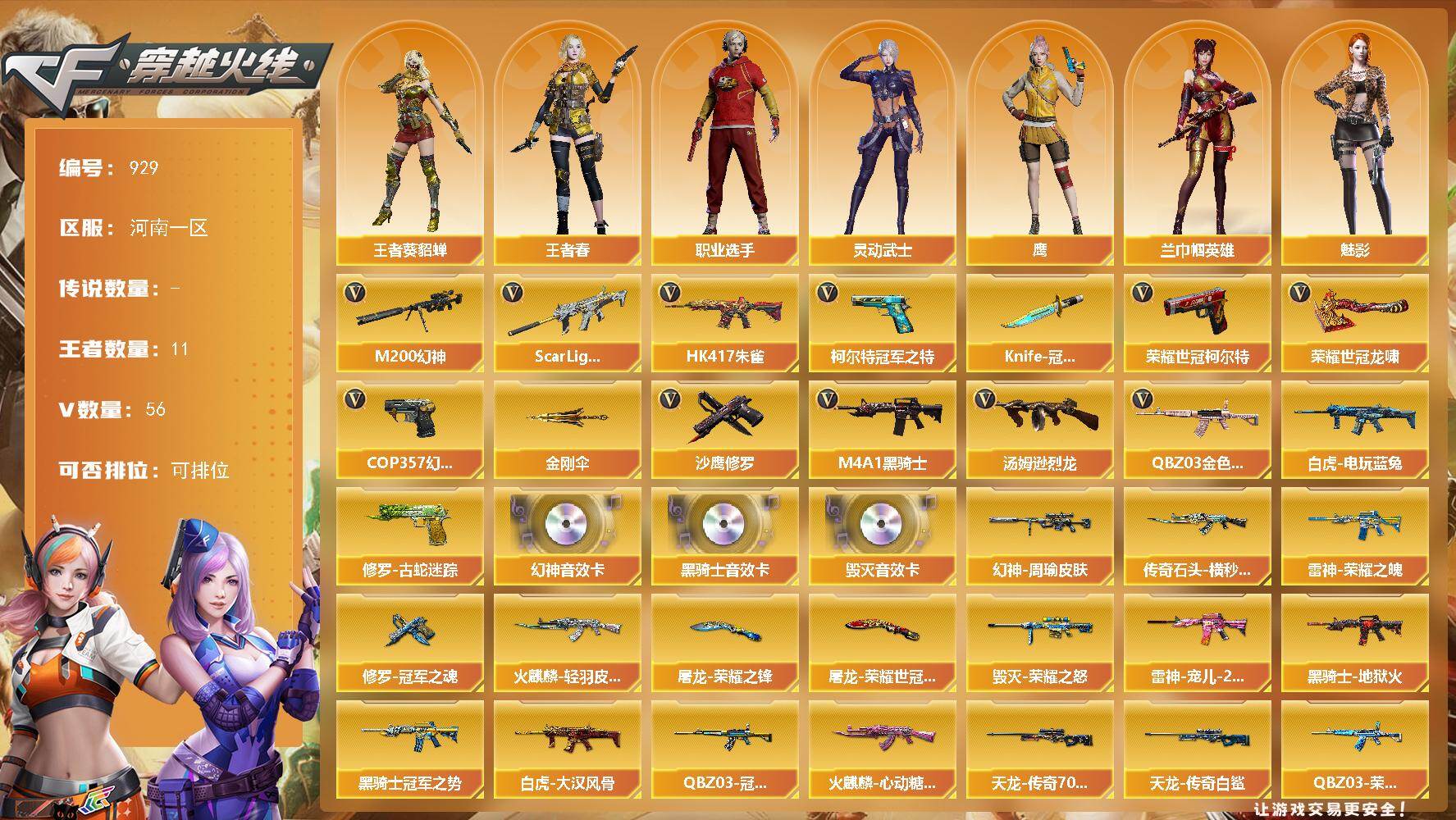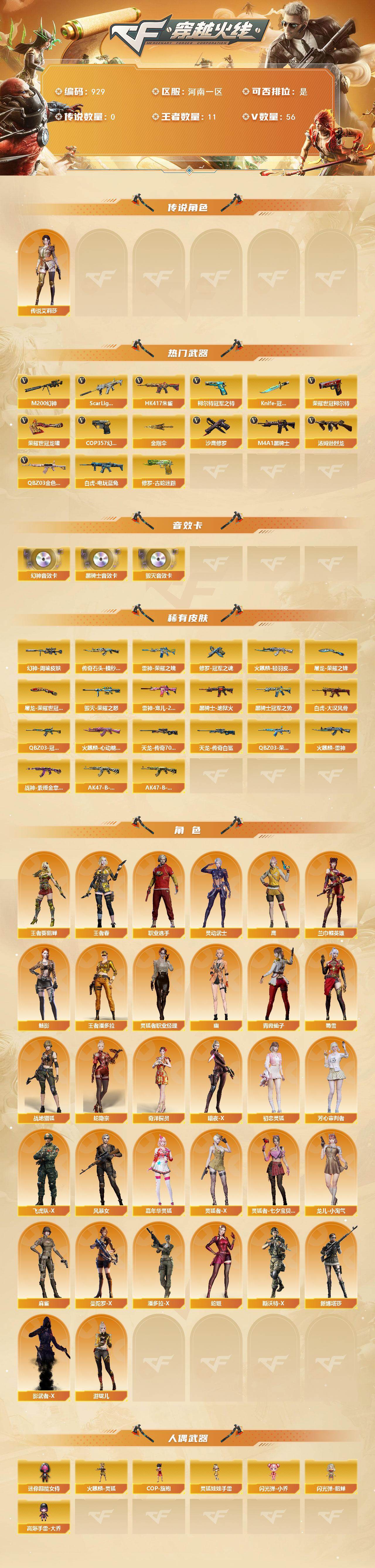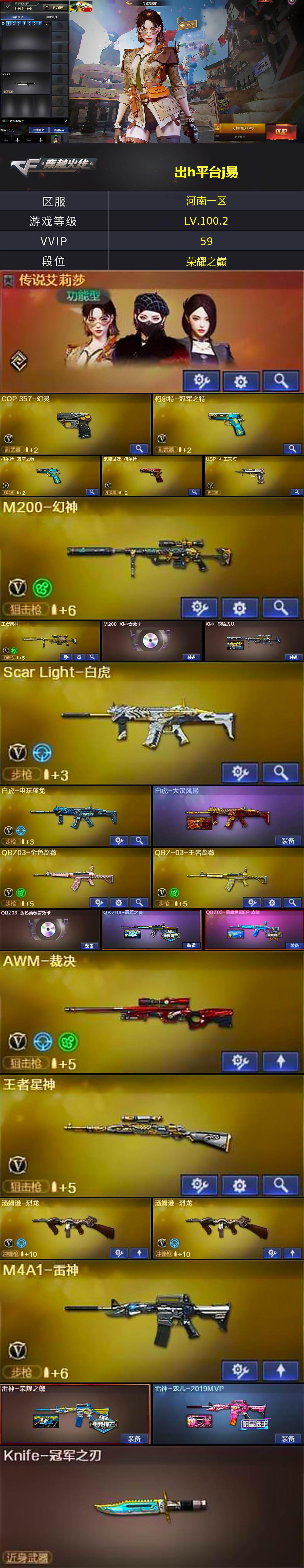 [15718752]河南一区-56V-11王者-0炫金 【传说角色】:传说艾莉莎 【热门武器】:QBZ03-金色蔷薇,Scar Light-白虎,HK417-朱雀,M200-幻神,修罗-古蛇迷踪,白虎-电玩蓝兔,柯尔特-冠军之特*2,荣耀世冠-柯尔特,M4A1-黑骑士,汤姆逊-烈龙*2,COP 357-幻灵,沙鹰-修罗*3,Knife-冠军之刃,荣耀世冠-龙啸,金刚伞 【音效卡】:M200-幻神音效卡,M4A1-黑骑士音效卡,Barrett-毁灭音效卡 【皮肤】:幻神-周瑜皮肤,白虎-大汉风骨,QBZ03-冠军之薇,QBZ03-荣耀世冠EP 皮肤,雷神-荣耀之魄,雷神-宠儿-2019MVP,火麒麟-雷神,火麒麟-轻羽皮肤,传奇石头-横秒之巅,火麒麟-心动糖果,毁灭-荣耀之怒,黑骑士-冠军之势,黑骑士-地狱火,战神-紫绶金章皮肤,AK47-B-常胜将军-刘备*2,AK47-B-常胜将军-孙权*2,AWM-天龙-传奇70KG,AWM-天龙-传奇白鲨,修罗-冠军之魂,屠龙-荣耀之锋,屠龙-荣耀世冠AG 【角色】:魅影,鹰,兰-巾帼英雄,战地猎狐,王者-葵-貂蝉,王者春,王者潘多拉,蛇隐宗,奇洋探员,暗夜-X,初恋灵狐,芳心审判者,飞虎队-X,风暴女*2,嘉年华灵狐,灵动武士,灵狐者-X,灵狐者-七夕宝贝,灵狐者-职业经理,龙儿-小淘气,麻雀,曼陀罗-X,潘多拉-X,青霞仙子,蛇姬,斯沃特-X,蜀雪,新娜塔莎,影武者-X,幽,游珑儿,职业选手 【人偶武器】:火麒麟-灵狐,COP-旗袍,闪光弹-小乔,闪光弹-貂蝉,高爆手雷-大乔,迷你超能女侍,灵狐娃娃手雷 【暴走生化】:黑龙吞噬者,双面神,超级对讲机 【英雄级武器】:AK47-火麒麟,M4A1-雷神,M4A1-黑骑士,AK47-无影,AK12-天启,M4A1-龙血,HK417-朱雀,Scar Light-白虎,黑武士-锦绣游龙,QBZ03-金色蔷薇,M4A1-猎神,超新星-悦享-觉醒版,QBZ-03-王者蔷薇-觉醒版,白虎-电玩蓝兔,AWM-天龙,Barrett-毁灭,Barrett-极光,AWM-裁决,M200-幻神,王者星神-觉醒版,王者风神-觉醒版,炼狱-悦蓝-觉醒版,汤姆逊-烈龙*2,沙鹰-修罗*3,沙鹰-天神,COP 357-幻灵,柯尔特-冠军之特*2,荣耀世冠-柯尔特,USP-神工天巧,王者之灵-觉醒版,修罗-古蛇迷踪,屠龙,麒麟
