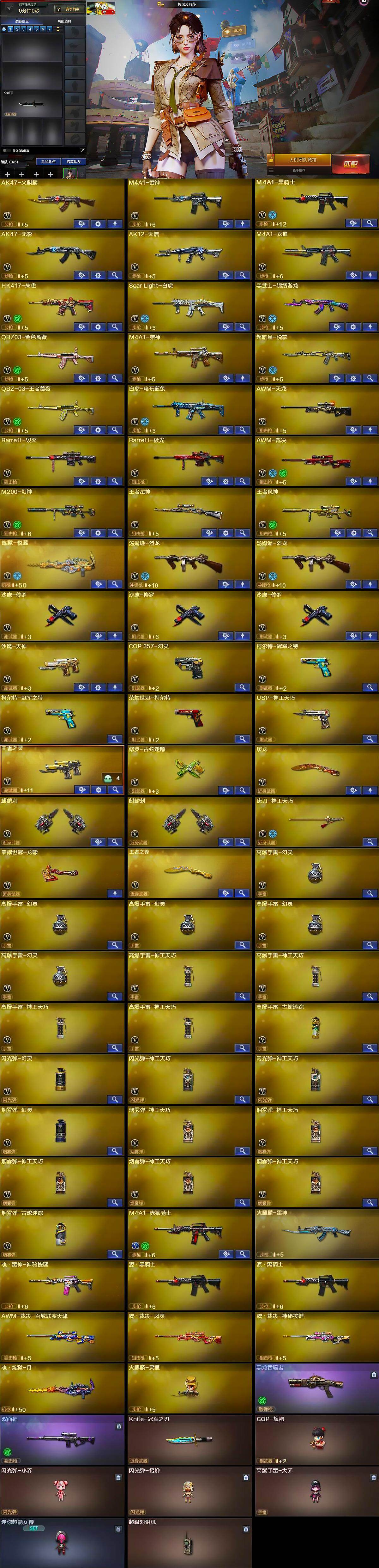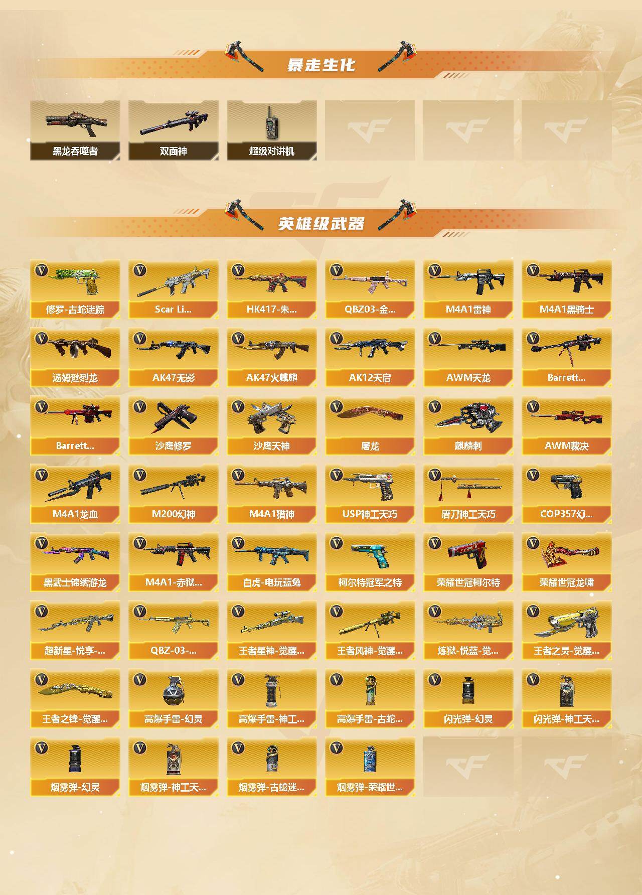 【英雄级武器】:AK47-火麒麟,M4A1-雷神,M4A1-黑骑士,AK47-无影,AK12-天启,M4A1-龙血,HK417-朱雀,Scar Light-白虎,黑武士-锦绣游龙,QBZ03-金色蔷薇,M4A1-猎神,超新星-悦享-觉醒版,QBZ-03-王者蔷薇-觉醒版,白虎-电玩蓝兔,AWM-天龙,Barrett-毁灭,Barrett-极光,AWM-裁决,M200-幻神,王者星神-觉醒版,王者风神-觉醒版,炼狱-悦蓝-觉醒版,汤姆逊-烈龙*2,沙鹰-修罗*3,沙鹰-天神,COP 357-幻灵,柯尔特-冠军之特*2,荣耀世冠-柯尔特,USP-神工天巧,王者之灵-觉醒版,修罗-古蛇迷踪,屠龙,麒麟