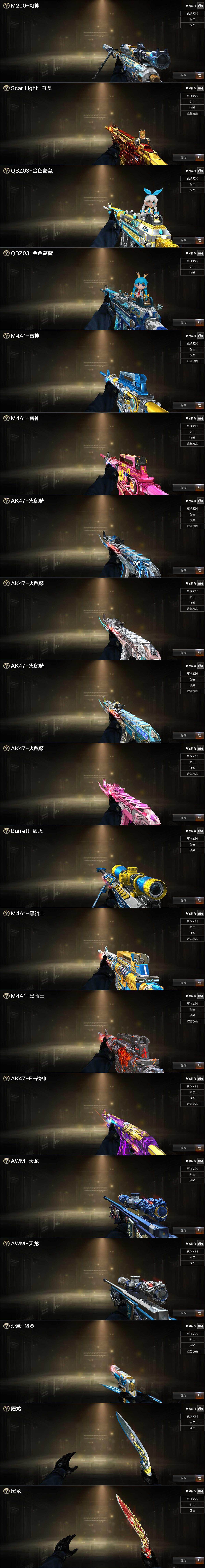 【热门武器】:QBZ03-金色蔷薇,Scar Light-白虎,HK417-朱雀,M200-幻神,修罗-古蛇迷踪,白虎-电玩蓝兔,柯尔特-冠军之特*2,荣耀世冠-柯尔特,M4A1-黑骑士,汤姆逊-烈龙*2,COP 357-幻灵,沙鹰-修罗*3,Knife-冠军之刃,荣耀世冠-龙啸,金刚伞