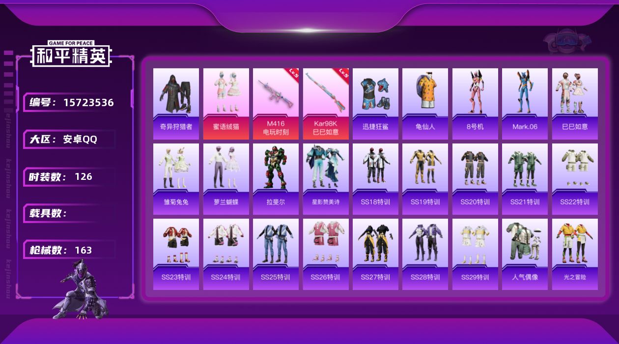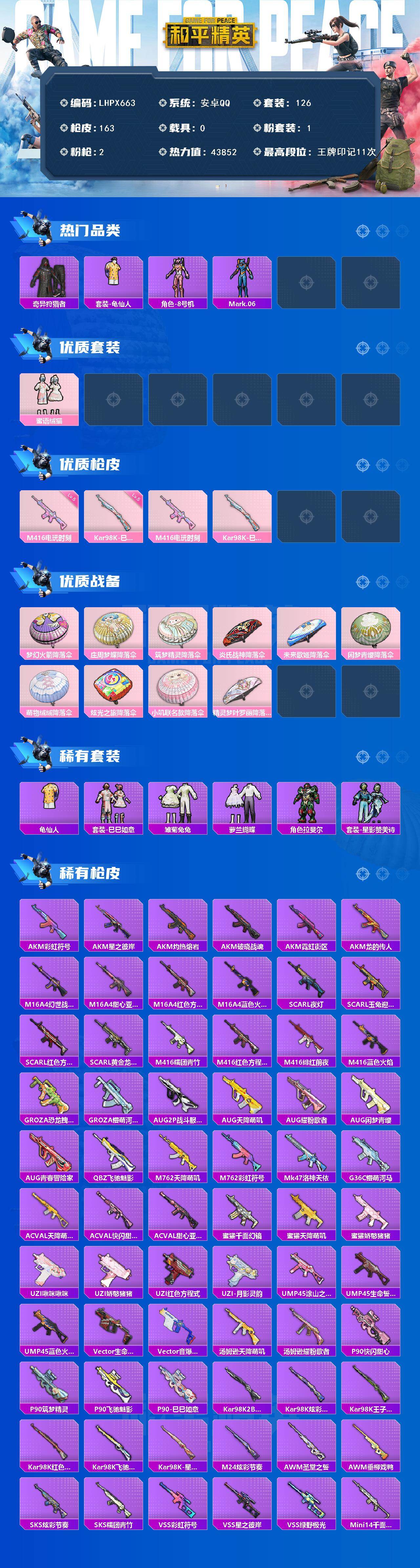 [15723536]安卓 手Q-1粉装-2特效枪-0载具-0粉色飞行器-43852热力值-11王牌印记-126套装-163枪皮 【热门品类】:套装-奇异狩猎者,套装-龟仙人,角色-8号机,角色-Mark.06 【粉色套装】:粉装-蜜语绒猫 【粉色枪皮等级】:M416-电玩时刻(五级),Kar98K-巳巳如意(五级) 【粉色枪皮】:M416-电玩时刻,Kar98K-巳巳如意 【粉色降落伞】:梦幻火箭降落伞,庄周梦蝶降落伞,筑梦精灵降落伞,炎氏战神降落伞,未来歌姬降落伞,闲梦青缨降落伞,萌物绒绒降落伞,炫光之旅降落伞,小叽联名款降落伞,精灵梦叶罗丽降落伞 【稀有套装】:套装-龟仙人,套装-巳巳如意,套装-雏菊兔兔,套装-萝兰蝴蝶,角色-拉斐尔,套装-星影赞美诗 【稀有枪皮】:AKM-彩虹符号,AKM-星之彼岸,AKM-灼热熔岩,AKM-破晓战魂,AKM-霓虹街区,AKM-龙的传人,M16A4-幻世战舞者,M16A4-甜心亚梦,M16A4-红色方程式,M16A4-蓝色火焰,SCAR-L-夜灯,SCAR-L-玉兔迎春,SCAR-L-红色方程式,SCAR-L-黄金龙骨,M416-糯团青竹,M416-红色方程式,M416-绯红前夜,M416-蓝色火焰,GROZA-恐龙拽拽,GROZA-懵萌河马,AUG-2P战斗服款,AUG-天降萌叽,AUG-耀粉歌者,AUG-闲梦青缨,AUG-青春冒险家,QBZ-飞驰魅影,M762-天降萌叽,M762-彩虹符号,Mk47-洛神天依,G36C-懵萌河马,AC-VAL-天降萌叽,AC-VAL-快闪甜心,AC-VAL-甜心亚梦,蜜獾-千面幻镜,蜜獾-天降萌叽,蜜獾-娇憨猪猪,UZI-啾咪啾咪,UZI-娇憨猪猪,UZI-红色方程式,UZI-月影灵韵,UMP45-涂山之恋,UMP45-生命誓言,UMP45-蓝色火焰,Vector-生命誓言,Vector-音爆索尼克,汤姆逊-天降萌叽,汤姆逊-耀粉歌者,P90-快闪甜心,P90-筑梦精灵,P90-飞驰魅影,P90-巳巳如意,Kar98K-2B战斗服款,Kar98K-炫彩节奏,Kar98K-王子的夏天,Kar98K-红色方程式,Kar98K-飞驰魅影,Kar98K-星穹咏叹调,M24-炫彩节奏,AWM-圣堂之誓,AWM-垂柳戏鸭,SKS-炫彩节奏,SKS-糯团青竹,VSS-彩虹符号,VSS-星之彼岸,VSS-绿野极光,Mini