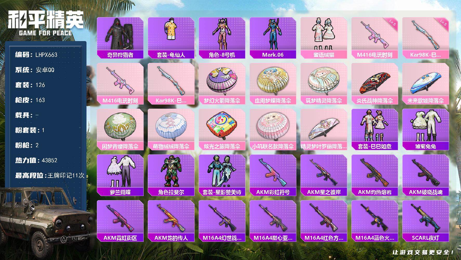 [15723536]安卓 手Q-1粉装-2特效枪-0载具-0粉色飞行器-43852热力值-11王牌印记-126套装-163枪皮