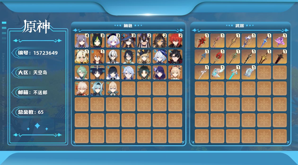 0命阿蕾奇诺,0命闲云,0命娜维娅,0命芙宁娜,0命莱欧斯利,0命白术,2命迪希雅,0命流浪者,2命赛诺,3命提纳里,0命夜兰,0命神里绫人,0命优菈,0命雷电将军,0命枫原万叶,0命魈,0命宵宫,1命达达利亚,4命刻晴,3命七七,0命琴,3命莫娜,2命迪卢克,1命希诺宁,0命丝柯克,0命奈芙尔,精1赤月之形,精1最初的大魔术,精1苇海信标,精1赤沙之杖,精1若水,精1波乱月白经津,精1神乐之真意,精1息灾,精1护摩之杖,精1四风原典,精1和璞鸢,精1天空之刃,精1斫峰之刃,精1天空之卷,精1风鹰剑,精1狼的末路