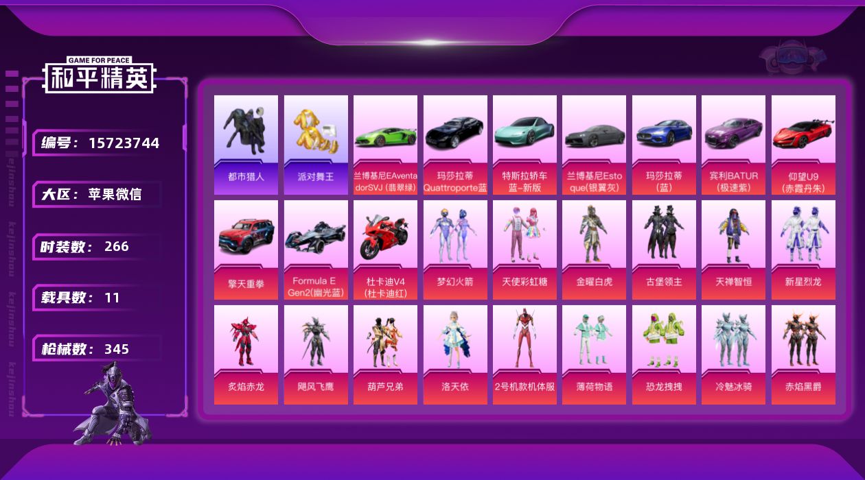 [15723744]【特价出售/店主推荐】苹果 微信-43粉装-19特效枪-11载具-8粉色飞行器-139238热力值-14王牌印记-266套装-345枪皮 【热门品类】:粉装-梦幻火箭,套装-都市猎人,套装-派对舞王,角色-军刀雅典娜,套装-暗夜行者,套装-龟仙人,套装-浪漫波比,角色-8号机,角色-Mark.06 【粉色套装】:粉装-天使彩虹糖,粉装-金曜白虎,粉装-梦幻火箭,粉装-古堡领主,粉装-天禅智恒,粉装-新星烈龙,粉装-炙焰赤龙,粉装-飓风飞鹰,粉装-葫芦兄弟,角色-洛天依,角色-2号机款机体服,粉装-薄荷物语,粉装-恐龙拽拽,粉装-冷魅冰骑,粉装-赤焰黑爵,粉装-紫电风暴,粉装-甜梦小狐,角色-复仇流浪者,粉装-绒雪飘舞,粉装-傲雪凌霜,粉装-霁雪冰心,粉装-垂柳戏鸭,粉装-千面幻镜,粉装-冰川粉黛,粉装-冰川幽秘,粉装-冰川红玫,粉装-盖世英雄,粉装-光明术士,粉装-启明星,超级赛亚人-孙悟空,角色-白勺歌姬,角色-大黄蜂,角色-茉莉星,粉装-傲傲奶龙,角色-紫钛骑兵,玩偶服-猪猪侠,角色-美琪,角色-超弦星,角色-电磁星,角色-光极星,角色-冰域雷影,角色-狂花道·不知火舞,角色-樱桃泡泡 【粉色枪皮等级】:AKM-炫紫旋律(五级),AKM-梦之光华(一级),M16A4-垂柳戏鸭(二级),SCAR-L-天蓬元帅(四级),SCAR-L-锦绣绵绵(五级),M416-五爪金龙(一级),M416-心之恋语(一级),M416-风花雪月(一级),M416-至情至圣(一级),M416-全功率超战(一级),M416-超新星(九级),M416-女娲灵识(一级),AUG-暖羊咩咩(五级),UMP45-量子极限(五级),Vector-环太平洋(四级),汤姆逊-冰川粉黛(二级),Kar98K-巳巳如意(五级),Mk14-樱桃泡泡(四级),M249-绒雪飘舞(四级) 【粉色载具】:特斯拉Roadster(水滴蓝),兰博基尼Aventador SVJ(翡翠绿),兰博基尼Estoque(银翼灰),玛莎拉蒂Quattroporte(夜幕蓝),玛莎拉蒂Ghibli(蓝),宾利BATUR(极速紫),仰望U9(赤霞丹朱),擎天重拳,Formula E Gen2(幽光蓝),杜卡迪 Panigale V4(杜卡迪红),空客H135-蔚蓝之翼 【粉色枪皮】:AKM-炫紫旋律,AKM-梦之光华,M16A4-垂