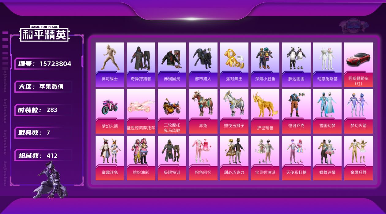 [15723804]【特价出售/店主推荐】苹果 微信-无敌战神框-33粉装-31特效枪-7载具-5粉色飞行器-156348热力值-21王牌印记-283套装-412枪皮 【热门品类】:粉装-怪诞乔克,粉装-雪国幻梦,粉装-梦幻火箭,粉装-童趣迷兔,粉装-缤纷油彩,套装-浪漫天命,套装-赤蝎幽灵,套装-都市猎人,套装-冥河战士,套装-派对舞王,套装-深海小丑鱼,套装-小丑鱼,套装-奇异狩猎者,套装-胖达圆圆,套装-动感兔斯基人偶服,套装-AG战队服,角色-忠真马岱,套装-潮萌小黄鸭,套装-暗影哥特,套装-浪漫波比,套装-萌熊伴侣,角色-六号稻草人,M416-星际漫游,大砍刀-青龙偃月刀,撬棍-龙胆亮银枪,套装-红熊茄茄 【粉色套装】:粉装-极限特训,粉装-粉色回忆,粉装-怪诞乔克,粉装-甜心巧克力,粉装-宝贝奶油派,粉装-天使彩虹糖,粉装-雪国幻梦,粉装-蝶舞迷情,粉装-梦幻火箭,粉装-金属狂野,粉装-缤纷油彩,粉装-放客神游,粉装-花间之火,粉装-俏皮狐尾,粉装-冰霜白皇,粉装-童趣迷兔,粉装-炙焰红王,粉装-香水柠檬,粉装-馨动时刻,粉装-暗夜玫瑰,角色-闪耀迪迦,粉装-彩虹鹿灵,角色-洛天依,粉装-岚岚物语,粉装-橘柚倾心,粉装-灵感创作师,粉装-炫光之旅,粉装-暖暖奶龙,角色-月影灵韵,角色-樱桃泡泡,角色-冷漠罗丽,角色-荧海星豚,角色-绯穹魔姬 【粉色枪皮等级】:AKM-炫紫旋律(一级),AKM-百合蜜语(七级),AKM-魔法神域(三级),SCAR-L-童趣迷兔(一级),SCAR-L-金蛇镇世(六级),M416-心之恋语(一级),M416-暖熊萌萌(七级),GROZA-焦糖拿铁(四级),AUG-超新星(五级),M762-甜蜜誓约(六级),蜜獾-荧海星豚(一级),蜜獾-异瞳寒姬(五级),UZI-绮梦青鸾(五级),UMP45-相思残雪(四级),Vector-灵感创作师(六级),Vector-绯穹魔姬(一级),汤姆逊-热量炸弹(五级),P90-能量风暴(五级),P90-冷漠罗丽(一级),Kar98K-绿意幻情(三级),Kar98K-巳巳如意(五级),Kar98K-圣域龙灵(三级),AWM-橘柚倾心(四级),Mk14-樱桃泡泡(四级),Mk14-甜梦熊击(五级),AMR-智耀战神(四级),S12K-海渊国主(五级),DP-28-豹影疾电(五级),MG3-洛神天依(四级),平底锅-林间