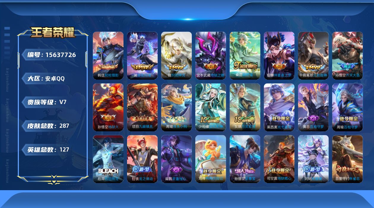[15637726]可二次【店主推荐捡漏号!可直接换绑】安卓Q-V7-最强王者段位-126英雄-284皮肤-1典藏皮肤-9传说-73史诗-3星传说 【英雄全皮】:孙权全皮,空空儿全皮,影全皮 【荣耀典藏】:韩信弑枪猎影 【传说皮肤】:后羿神树通天,桑启鸣野蒿,澜逐花归海,孙悟空齐天大圣,镜炽阳神光,干将莫邪久胜战神,貂蝉仲夏夜之梦,宫本武藏地狱之眼,孙悟空地狱火 【限定皮肤】:蔡文姬夏日便利店,大乔绒语心约,虞姬夏日便利店,姜子牙天穹之誓,李白谪仙醉月,狄仁杰阴阳师,赵云皇家上将,孙尚香蔷薇恋人,庄周高山流水,高渐离玩趣恶龙,元歌无心,狄仁杰魔术师,狄仁杰万华元夜,达摩沙漠行僧,项羽海滩派对,程咬金演武夺筹,王昭君午后时光,兰陵王金庭之子,孙悟空至尊宝,孙悟空齐天大圣,李元芳云中旅人,钟馗驱傩正仪,干将莫邪胡桃夹子,鬼谷子原初探秘者,鬼谷子五谷丰年,苏烈千军破阵,百里守约朱雀志,沈梦溪大漠名商,裴擒虎擒涛扼浪,狂铁电玩高手,云中君纤云弄巧,猪八戒猪悟能,嫦娥拒霜思,鲁班大师探海日志,镜匿光追影者,桑启海盐诗旅,司空震地狱燃心,阿古朵江河有灵,张良古海寻踪,妲己灵卜魔法,鬼谷子天穹祈灯,沈梦溪龙舞盛年,刘邦剑破天穹 【年限皮肤】:百里守约朱雀志 【赛季限定】:狄仁杰万华元夜,达摩沙漠行僧,程咬金演武夺筹,兰陵王金庭之子,张良古海寻踪,李元芳云中旅人,钟馗驱傩正仪,鬼谷子原初探秘者,苏烈千军破阵,沈梦溪大漠名商,裴擒虎擒涛扼浪,鲁班大师探海日志,桑启海盐诗旅,鬼谷子天穹祈灯,刘邦剑破天穹,姜子牙天穹之誓 【战令限定】:蔡文姬夏日便利店,虞姬夏日便利店,王昭君午后时光,狂铁电玩高手,司空震地狱燃心,妲己灵卜魔法 【史诗皮肤】:露娜紫霞仙子,赵云皇家上将,赵云未来纪元,貂蝉圣诞恋歌,甄姬冰雪圆舞曲,王昭君偶像歌手,狄仁杰魔术师,廉颇地狱岩魂,宫本武藏鬼剑武藏,孙尚香蔷薇恋人,孙尚香水果甜心,嬴政摇滚巨星,妲己女仆咖啡,墨子金属风暴,吕布圣诞狂欢,曹操幽灵船长,李白千年之狐,张飞乱世虎臣,韩信白龙吟,孙悟空至尊宝,花木兰水晶猎龙者,刘邦德古拉伯爵,夏侯惇乘风破浪,小乔缤纷独角兽,兰陵王暗隐猎兽者,诸葛亮黄金分割率,亚瑟心灵战警,安琪拉心灵骇客,百里守约特工魅影,铠曙光守护者,刘禅天才门将,李元芳逐浪之夏,程咬金功夫厨神,白起星夜王子,阿轲节奏热浪,孙策猫狗日记,大乔猫狗日记,百里守约朱雀志,伽