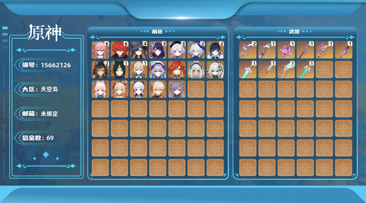 2命芙宁娜,2命迪希雅,0命纳西妲,1命提纳里,2命夜兰,满命八重神子,3命雷电将军,0命枫原万叶,0命神里绫华,0命宵宫,0命珊瑚宫心海,0命刻晴,3命七七,1命琴,4命莫娜,满命迪卢克,0命玛拉妮,0命玛薇卡,0命梦见月瑞希,0命丝柯克,0命菈乌玛,1命菲林斯,0命杜林,精1若水,精1神乐之真意,精1薙草之稻光,精1飞雷之弦振,精1雾切之回光,精1天空之脊,精1天空之翼,精2阿莫斯之弓,精1天空之刃,精1天空之傲