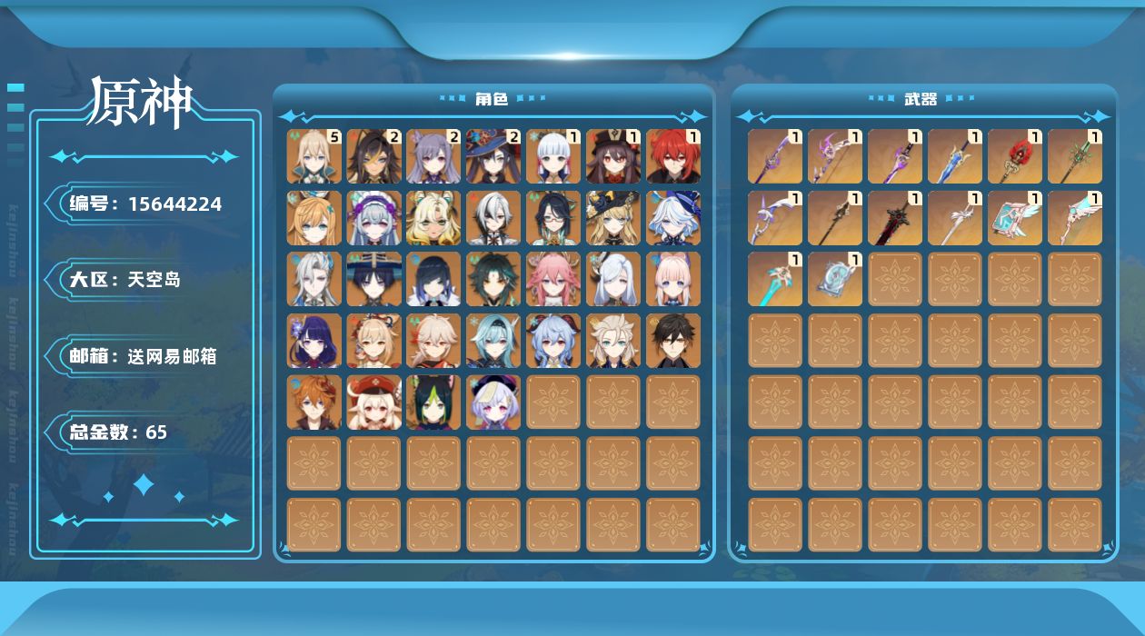 0命阿蕾奇诺,0命闲云,0命娜维娅,0命芙宁娜,0命那维莱特,2命迪希雅,0命流浪者,0命提纳里,0命夜兰,0命八重神子,0命申鹤,0命优菈,0命雷电将军,0命枫原万叶,1命神里绫华,0命钟离,1命胡桃,0命甘雨,0命魈,0命宵宫,0命可莉,0命达达利亚,0命阿贝多,0命珊瑚宫心海,2命刻晴,0命七七,5命琴,2命莫娜,1命迪卢克,0命希诺宁,0命梦见月瑞希,0命爱可菲,精1薙草之稻光,精1飞雷之弦振,精1雾切之回光,精1松籁响起之时,精1护摩之杖,精1四风原典,精1和璞鸢,精1贯虹之槊,精1天空之翼,精1阿莫斯之弓,精1天空之刃,精1天空之卷,精1风鹰剑,精1狼的末路