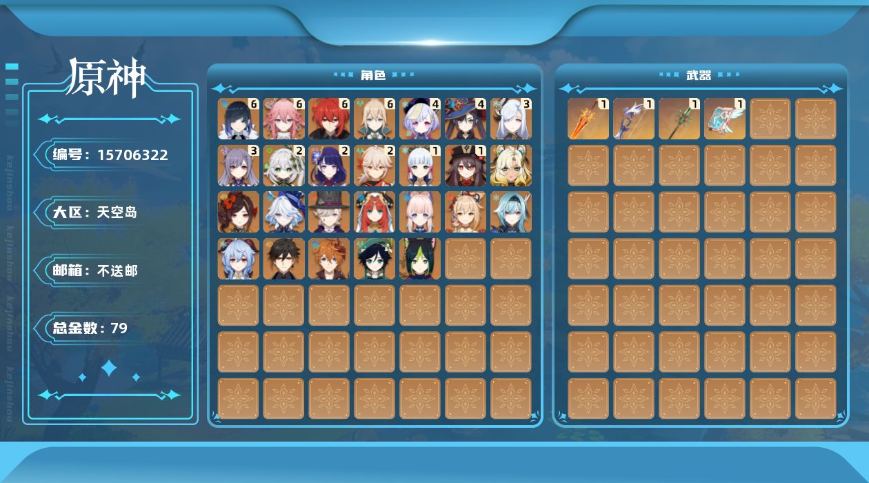 0命千织,0命芙宁娜,0命林尼,2命纳西妲,0命妮露,0命提纳里,满命夜兰,满命八重神子,3命申鹤,0命优菈,2命雷电将军,2命枫原万叶,1命神里绫华,0命钟离,1命胡桃,0命甘雨,0命宵宫,0命温迪,0命达达利亚,0命珊瑚宫心海,3命刻晴,4命七七,满命琴,4命莫娜,满命迪卢克,0命希诺宁,0命丝柯克,0命菲林斯,精1若水,精1和璞鸢,精1天空之卷,精1焚曜千阳,精1支离轮光