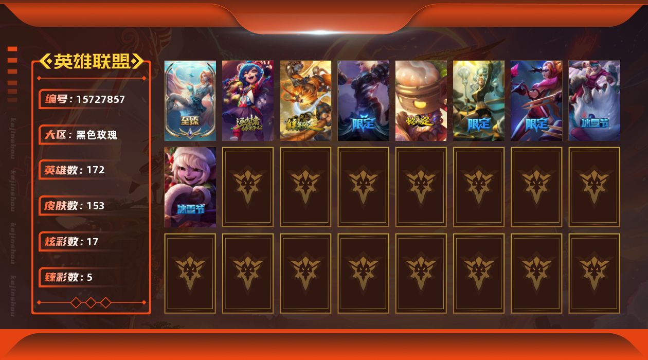 [15727857]【特价出售/店主推荐】青铜段位-172英雄-153皮肤-17炫彩-0终极-3神话-12限定-10传说-45史诗