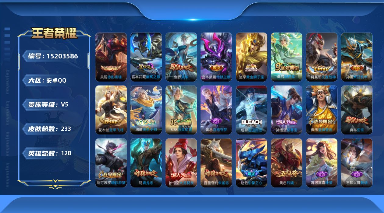 [15203586]安卓Q-V5-最强王者段位-127英雄-230皮肤-1典藏皮肤-8传说-68史诗