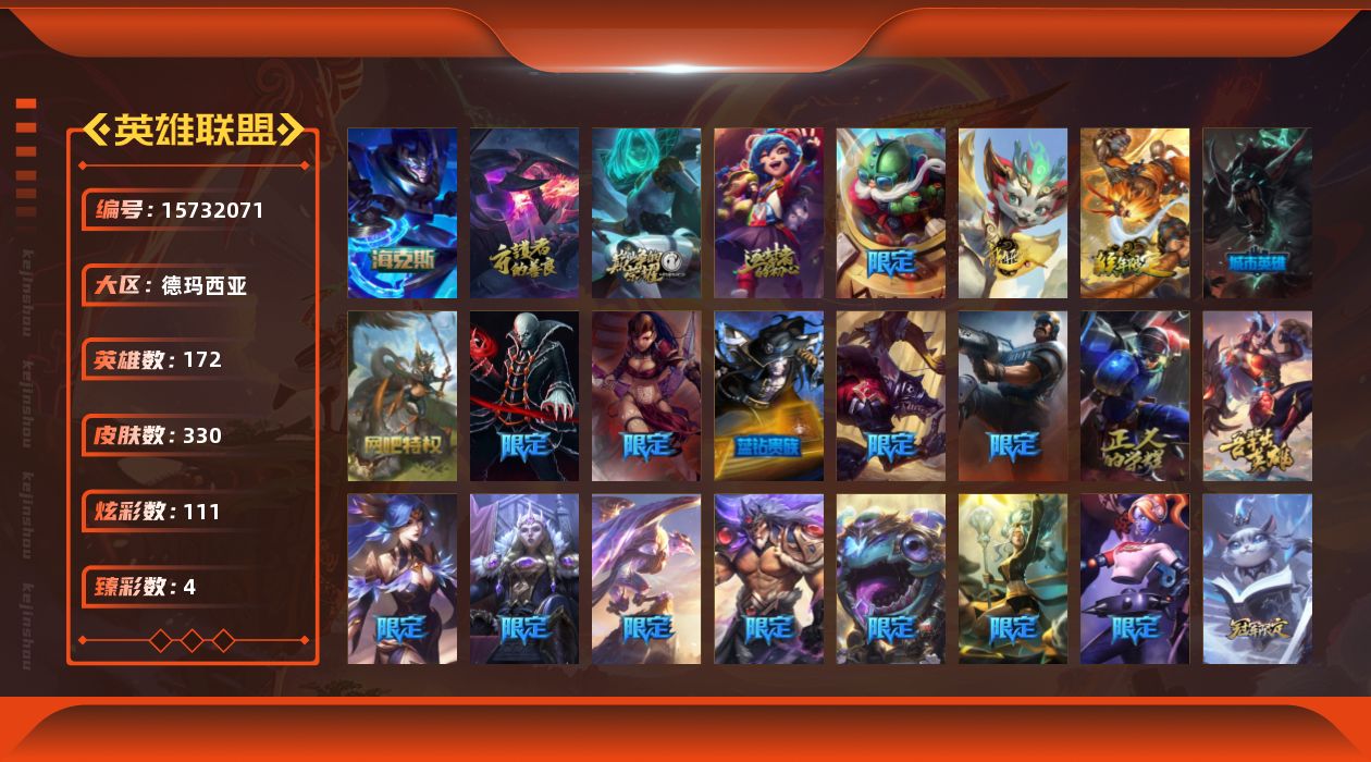 [15732071]可二次【特价出售/店主推荐】白银段位-172英雄-330皮肤-111炫彩-0终极-5神话-28限定-22传说-84史诗