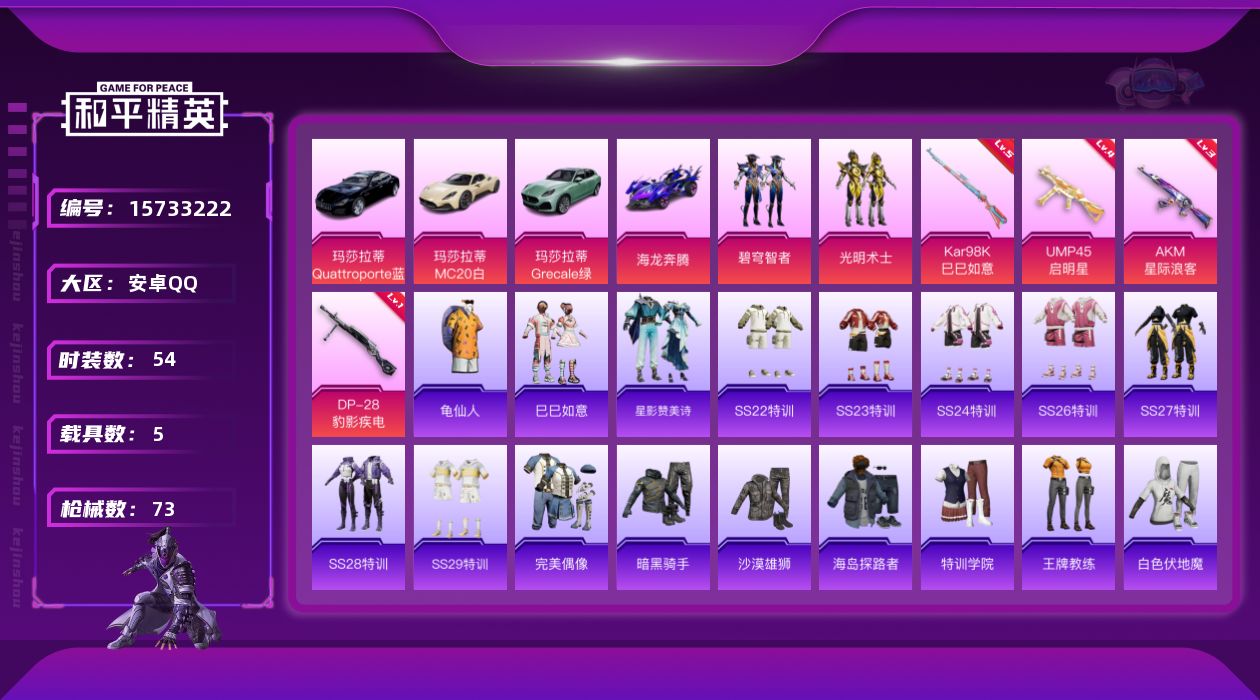 [15733222]【店主推荐捡漏号!可直接换绑】安卓 手Q-2粉装-4特效枪-5载具-0粉色飞行器-26447热力值-1王牌印记-54套装-73枪皮【热门品类】:套装-龟仙人【粉色载具】:玛莎拉蒂MC20(星石白),玛莎拉蒂Quattroporte(夜幕蓝),玛莎拉蒂Grecale(薄荷绿),海龙奔腾,僚机-萌兔起飞【粉色套装】:粉装-碧穹智者,粉装-光明术士【粉色枪皮等级】:AKM-星际浪客(三级),UMP45-启明星(四级),Kar98K-巳巳如意(五级),DP-28-豹影疾电(一级)【粉色枪皮】:AKM-星际浪客,UMP45-启明星,Kar98K-巳巳如意,DP-28-豹影疾电