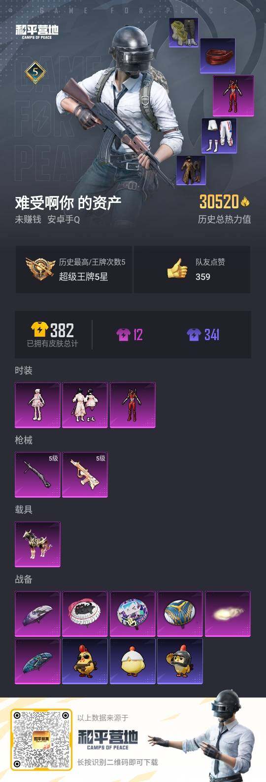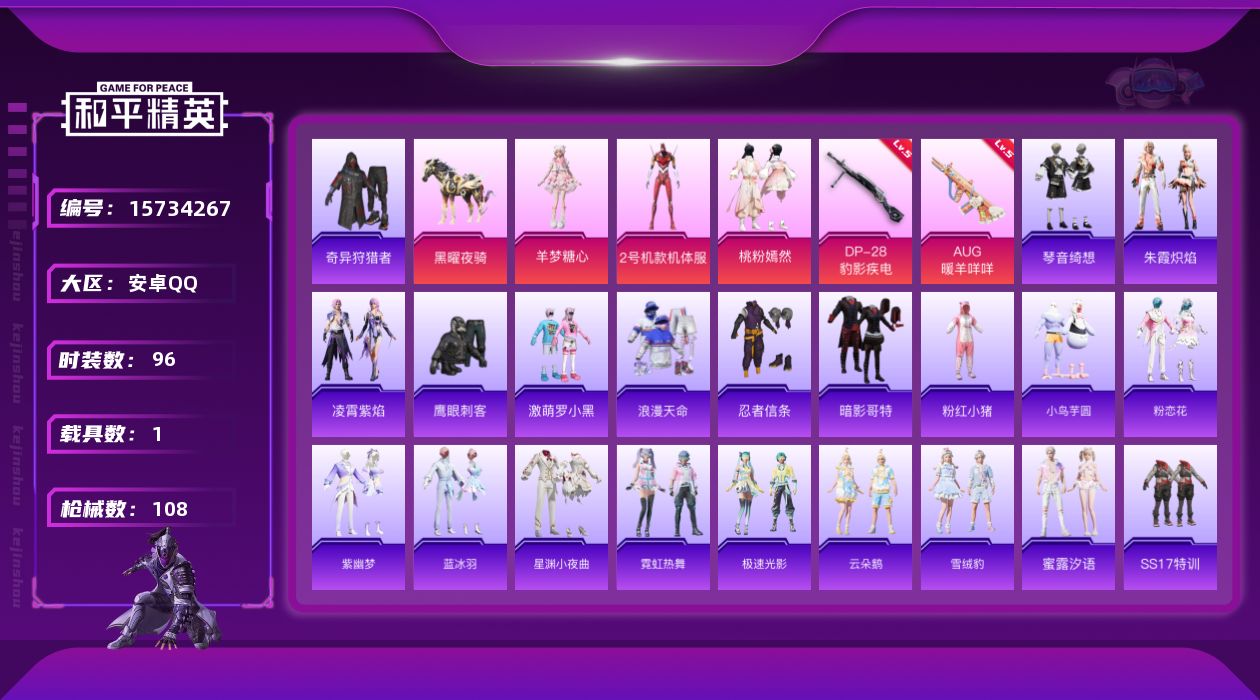 - PX_2060286-时装数: 107 枪械数: 144 战备数: 94 热门装扮: 鹰眼刺客,智耀战神 稀有枪皮: M416电玩时刻,UMP45量子极限,M762-青锋波束,GROZA-镜光银凌,AUG-暖羊咩咩,AMR-智耀战神
