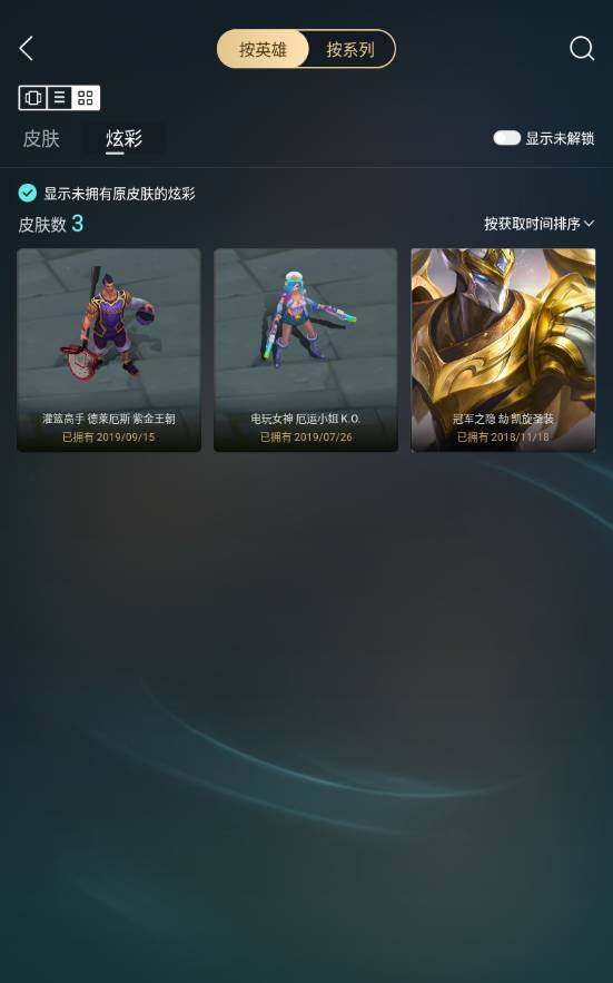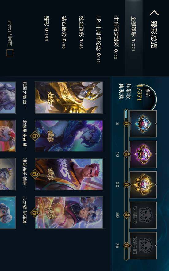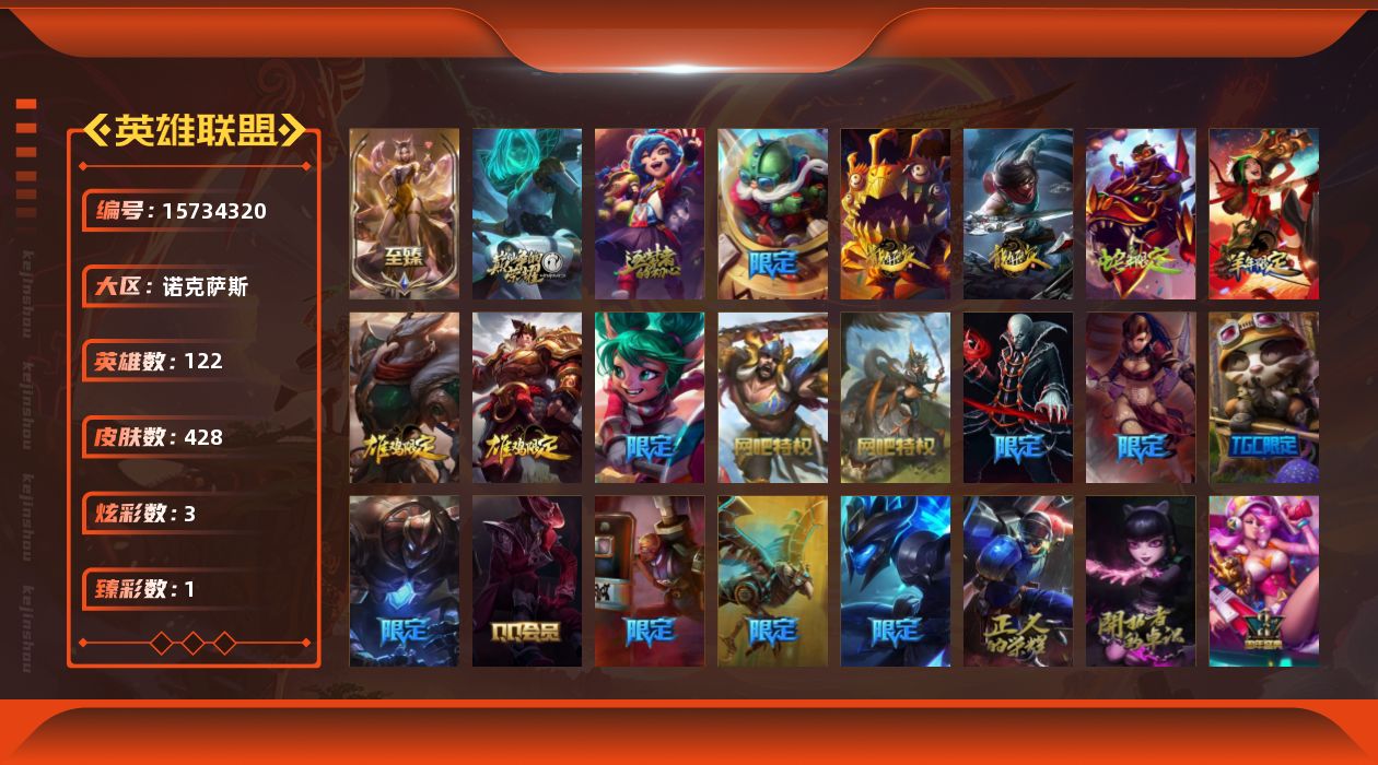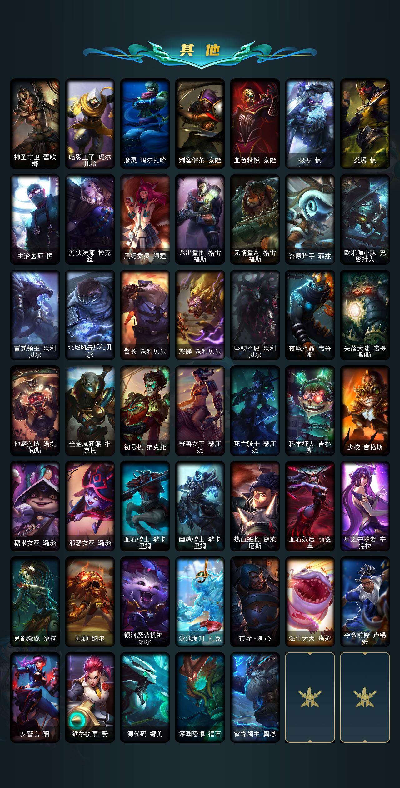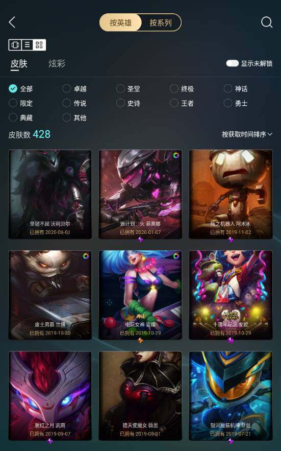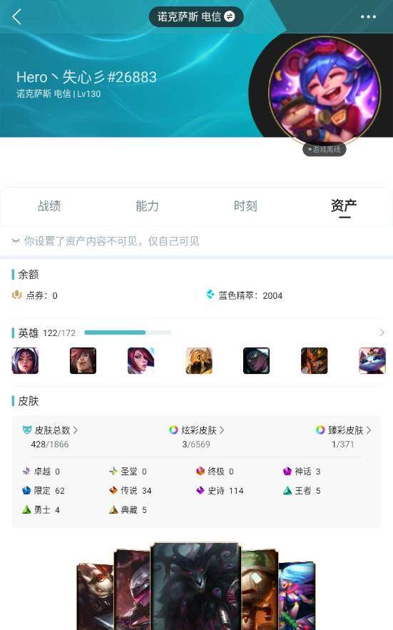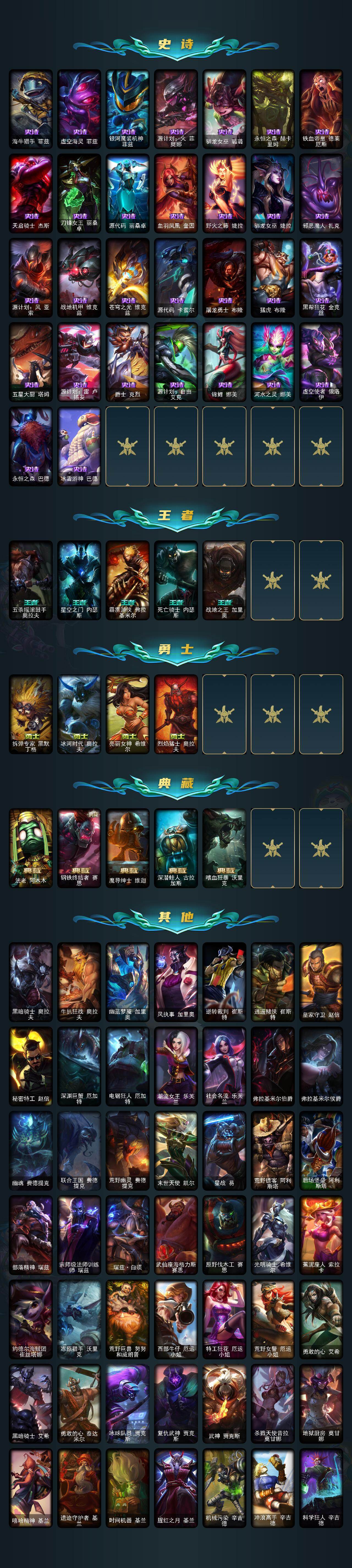 未定级段位-122英雄-428皮肤-3炫彩-0终极-3神话-62限定-34传说-114史诗