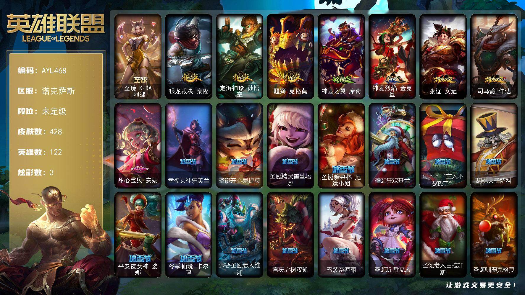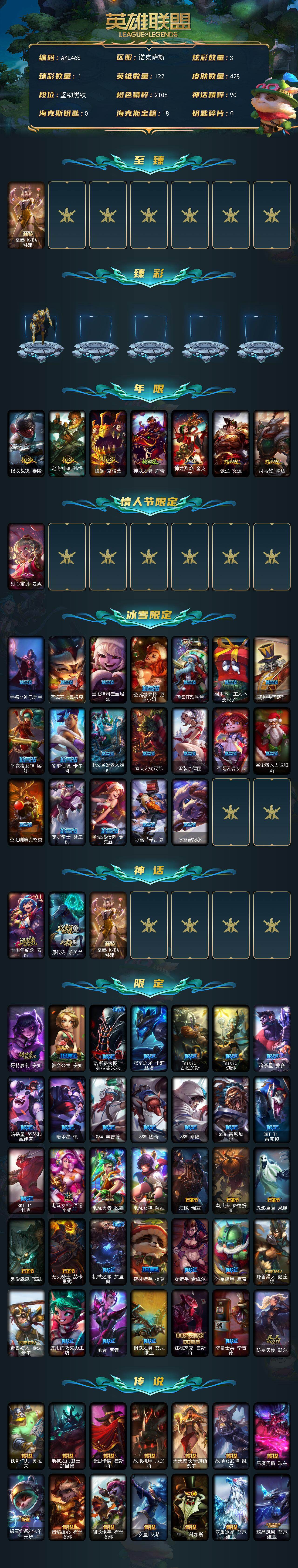 [15734320]【特价出售/店主推荐】 未定级段位-122英雄-428皮肤-3炫彩-0终极-3神话-62限定-34传说-114史诗 【至臻皮肤】:至臻KDA阿狸 【臻彩皮肤】:冠军之隐劫凯旋圣装 【年限皮肤】:银龙裁决泰隆,定海神珍孙悟空,醒狮克格莫,神龙之翼库奇,神龙烈焰金克丝,张辽文远,司马懿仲达 【情人节限定】:甜心宝贝安妮 【冰雪限定】:幸福女神乐芙兰,圣诞开心鬼提莫,圣诞精灵崔丝塔娜,圣诞糖果棒厄运小姐,圣诞狂欢基兰,阿木木“主人不要我了”,胡桃夹子萨科,平安夜女神娑娜,冬季仙境卡尔玛,邪恶圣诞老人维迦,喜庆之树茂凯,雪装奈德丽,圣诞玩偶波比,圣诞老人古拉加斯,圣诞驯鹿克格莫,魄罗骑士瑟庄妮,圣诞捣蛋鬼金克丝,冰雪节辛吉德,冰雪兽纳尔 【神话皮肤】:十周年纪念安妮,源代码乐芙兰,至臻KDA阿狸 【限定皮肤】:哥特萝莉安妮,舞会公主安妮,诺斯费拉图弗拉基米尔,冠军之矛卡莉丝塔,Fnatic古拉加斯,Fnatic迦娜,暗杀星蒙多,暗杀星努努和威朗普,暗杀星慎,SSW辛吉德,SSW图奇,SSW泰隆,SSW雷恩加尔,SKTT1雷克顿,SKTT1扎克,电玩女神厄运小姐,电玩勇者锐雯,电玩女神阿狸,海贼瑞兹,南瓜头费德提克,鬼影重重魔腾,鬼影森森茂凯,无头骑士赫卡里姆,机械迷城加里奥,密林猎手提莫,女猎手希维尔,外星装甲库奇,野兽猎人瑟庄妮,野兽猎人泰达米尔,波比的巧克力工坊,勇者阿狸,钢铁之翼艾尼维亚,红桃杰克崔斯特,防暴士兵辛吉德,防暴天使凯尔 【传说皮肤】:铁哥们儿奥拉夫,地狱之门卫士加里奥,魔幻卡牌崔斯特,战地机甲厄加特,大天使长米迦勒凯尔,战场女武神凯尔,恶魔男爵瑞兹,提莫约德尔人的一大步,烈焰雄心崔丝塔娜,驯龙炮手崔丝塔娜,女皇艾希,绅士科加斯,双重冰晶艾尼维亚,黯晶凤凰艾尼维亚,律政大亨蒙多,电玩女神娑娜,女主播迦娜,女警狙击凯特琳,陆地王者4WD布里茨,上古战魂魔腾,丧尸布兰德,银河魔装机神兰博,第三类接触黑默丁格,星之守护者拉克丝,枯萎之壤泽拉斯,黯黑魔龙希瓦娜,冰霜亚龙希瓦娜,偶像歌手阿狸,符文战熊沃利贝尔,苍穹之光韦鲁斯,宇航员诺提勒斯,女校长菲奥娜,泳池派对吉格斯,蔷薇绅士杰斯 【史诗皮肤】:冰霜烈焰安妮,安伯斯与提妮,绞肉机角斗士赵信,翼骑统领赵信,屠龙勇士赵信,重生之沙费德提克,圣光审判凯尔,天人合一易,侍魂易,战争机器赛恩,战场公主希维尔,钢铁之心希维