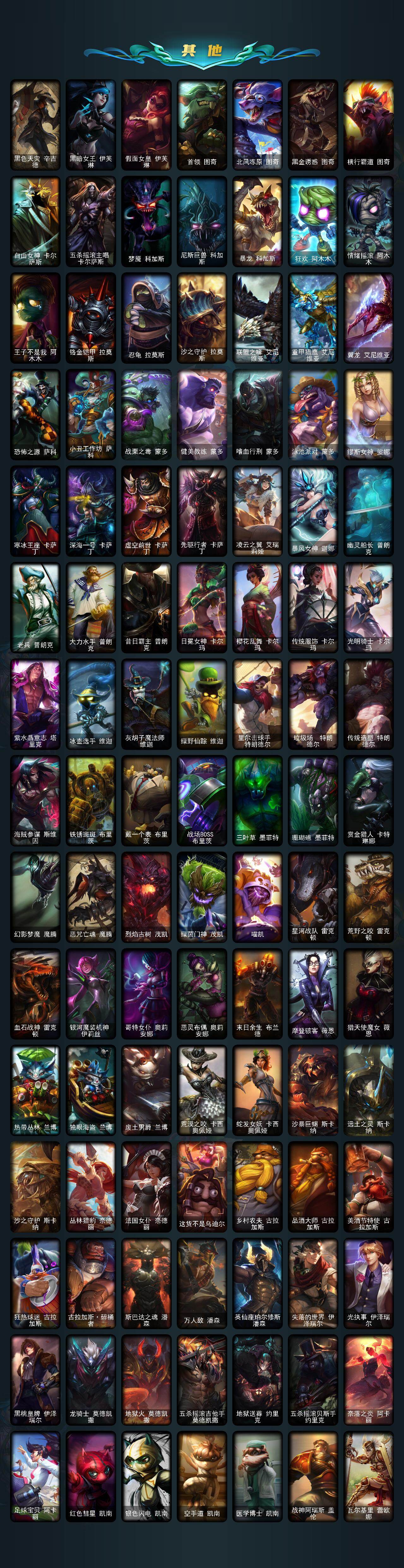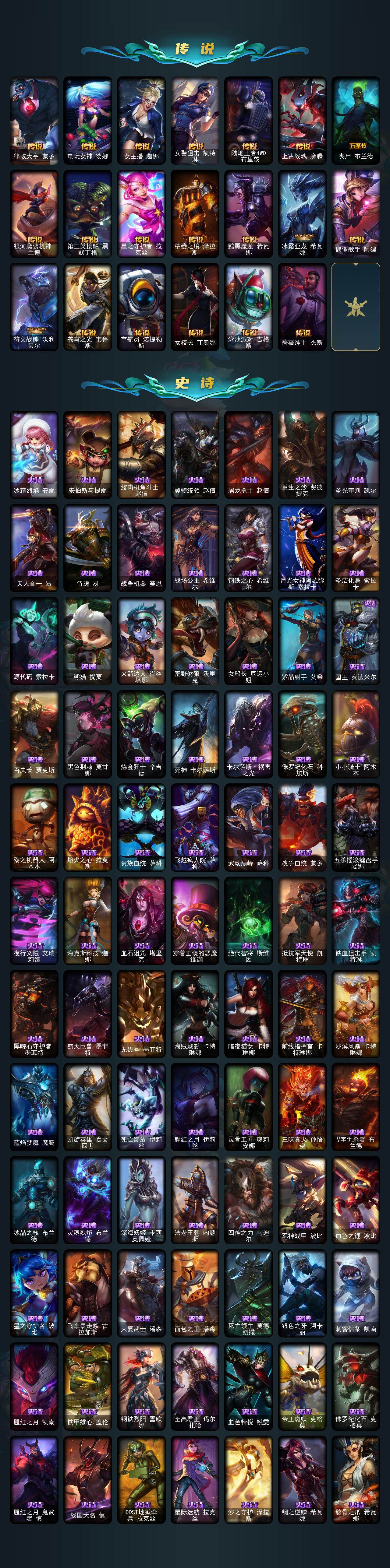 【传说皮肤】:铁哥们儿奥拉夫,地狱之门卫士加里奥,魔幻卡牌崔斯特,战地机甲厄加特,大天使长米迦勒凯尔,战场女武神凯尔,恶魔男爵瑞兹,提莫约德尔人的一大步,烈焰雄心崔丝塔娜,驯龙炮手崔丝塔娜,女皇艾希,绅士科加斯,双重冰晶艾尼维亚,黯晶凤凰艾尼维亚,律政大亨蒙多,电玩女神娑娜,女主播迦娜,女警狙击凯特琳,陆地王者4WD布里茨,上古战魂魔腾,丧尸布兰德,银河魔装机神兰博,第三类接触黑默丁格,星之守护者拉克丝,枯萎之壤泽拉斯,黯黑魔龙希瓦娜,冰霜亚龙希瓦娜,偶像歌手阿狸,符文战熊沃利贝尔,苍穹之光韦鲁斯,宇航员诺提勒斯,女校长菲奥娜,泳池派对吉格斯,蔷薇绅士杰斯