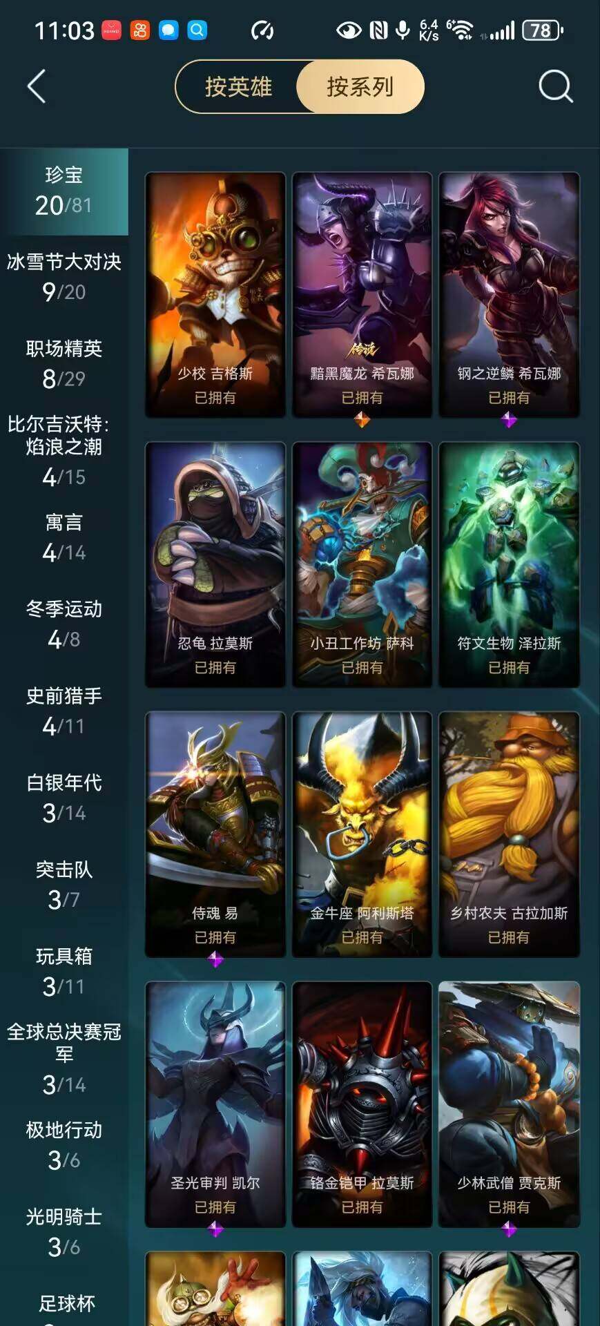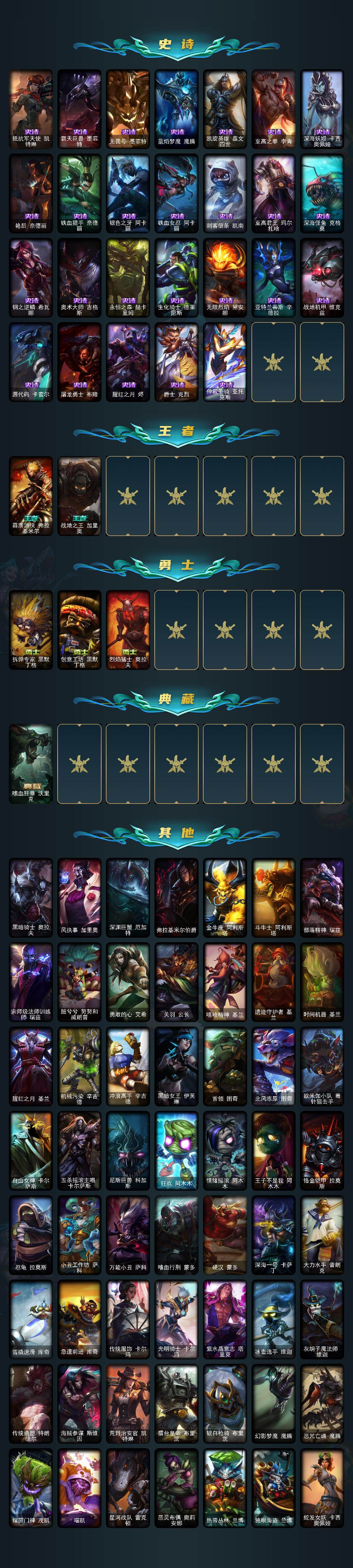 【史诗皮肤】:冰霜烈焰安妮,科学怪熊的新娘安妮,特战先锋赵信,摄魂男爵弗拉基米尔,重生之沙费德提克,圣光审判凯尔,侍魂易,圣洁化身索拉卡,荒野豺狼沃里克,少林武僧贾克斯,炼金狂士辛吉德,侏罗纪化石科加斯,小小骑士阿木木,殇之机器人阿木木,熔火之心拉莫斯,飞越疯人院萨科,海克斯科技迦娜,寒冰女皇迦娜,特种部队普朗克,北领前线斯维因,绝代智将斯维因,抵抗军天使凯特琳,霸天巨兽墨菲特,无畏号墨菲特,蓝焰梦魔魔腾,凯旋英雄嘉文四世,至高之拳李青,深海妖姬卡西奥佩娅,艳后奈德丽,铁血猎手奈德丽,银色之牙阿卡丽,铁血女忍阿卡丽,刺客信条凯南,至高君王玛尔扎哈,深海怪鱼克格莫,钢之逆鳞希瓦娜,奥术大师吉格斯,永恒之森赫卡里姆,生化骑士德莱厄斯,无限烈焰黛安娜,亚特兰蒂斯辛德拉,战地机甲维克兹,源代码卡蜜尔,屠龙勇士布隆,腥红之月烬,爵士克烈,仲裁圣骑亚托克斯