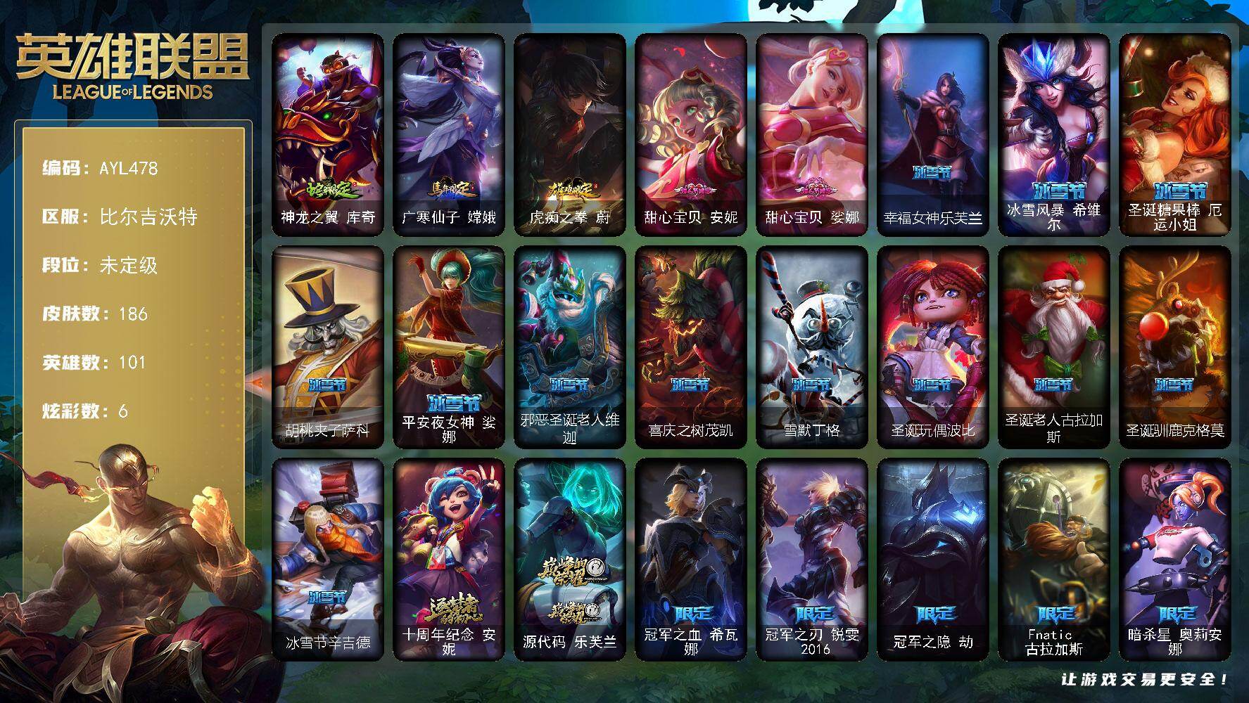 [15734653]可二次【特价出售/店主推荐】未定级段位-101英雄-186皮肤-6炫彩-0终极-2神话-34限定-15传说-47史诗 【臻彩皮肤】:冠军之隐劫凯旋圣装,霸天巨兽雪崩墨菲特 【年限皮肤】:神龙之翼库奇,广寒仙子嫦娥,虎痴之拳蔚 【情人节限定】:甜心宝贝安妮,甜心宝贝娑娜 【冰雪限定】:幸福女神乐芙兰,冰雪风暴希维尔,圣诞糖果棒厄运小姐,胡桃夹子萨科,平安夜女神娑娜,邪恶圣诞老人维迦,喜庆之树茂凯,雪默丁格,圣诞玩偶波比,圣诞老人古拉加斯,圣诞驯鹿克格莫,冰雪节辛吉德 【神话皮肤】:十周年纪念安妮,源代码乐芙兰 【限定皮肤】:冠军之血希瓦娜,冠军之刃锐雯2016,冠军之隐劫,Fnatic古拉加斯,暗杀星奥莉安娜,暗杀星伊泽瑞尔,SSW辛吉德,SKTT1卡莉丝塔,玉剑传说无影,鬼影森森茂凯,外星装甲库奇,野兽猎人瑟庄妮,野兽猎人泰达米尔,征服者卡尔玛,制胜金靴李青,防暴天使凯尔,警用试作体K9内瑟斯 【传说皮肤】:欧米伽小队幽灵特工,烈焰雄心崔丝塔娜,驯龙炮手崔丝塔娜,合金巨兽努努和威朗普,鬼魂新娘莫甘娜,红色男爵库奇,最终BOSS维迦,上古战魂魔腾,死亡骑士盖伦,黯黑魔龙希瓦娜,泳池派对吉格斯,霸天异形卡兹克,灌篮高手德莱厄斯,蔷薇绅士杰斯,黑夜使者亚索 【史诗皮肤】:冰霜烈焰安妮,科学怪熊的新娘安妮,特战先锋赵信,摄魂男爵弗拉基米尔,重生之沙费德提克,圣光审判凯尔,侍魂易,圣洁化身索拉卡,荒野豺狼沃里克,少林武僧贾克斯,炼金狂士辛吉德,侏罗纪化石科加斯,小小骑士阿木木,殇之机器人阿木木,熔火之心拉莫斯,飞越疯人院萨科,海克斯科技迦娜,寒冰女皇迦娜,特种部队普朗克,北领前线斯维因,绝代智将斯维因,抵抗军天使凯特琳,霸天巨兽墨菲特,无畏号墨菲特,蓝焰梦魔魔腾,凯旋英雄嘉文四世,至高之拳李青,深海妖姬卡西奥佩娅,艳后奈德丽,铁血猎手奈德丽,银色之牙阿卡丽,铁血女忍阿卡丽,刺客信条凯南,至高君王玛尔扎哈,深海怪鱼克格莫,钢之逆鳞希瓦娜,奥术大师吉格斯,永恒之森赫卡里姆,生化骑士德莱厄斯,无限烈焰黛安娜,亚特兰蒂斯辛德拉,战地机甲维克兹,源代码卡蜜尔,屠龙勇士布隆,腥红之月烬,爵士克烈,仲裁圣骑亚托克斯 【王者皮肤】:霹雳游侠弗拉基米尔,战地之王加里奥 【勇士皮肤】:拆弹专家黑默丁格,创意工坊黑默丁格,烈焰猛士奥拉夫 【典藏皮肤】:嗜血狂暴沃里克 【其他皮肤1】:黑暗骑士奥拉