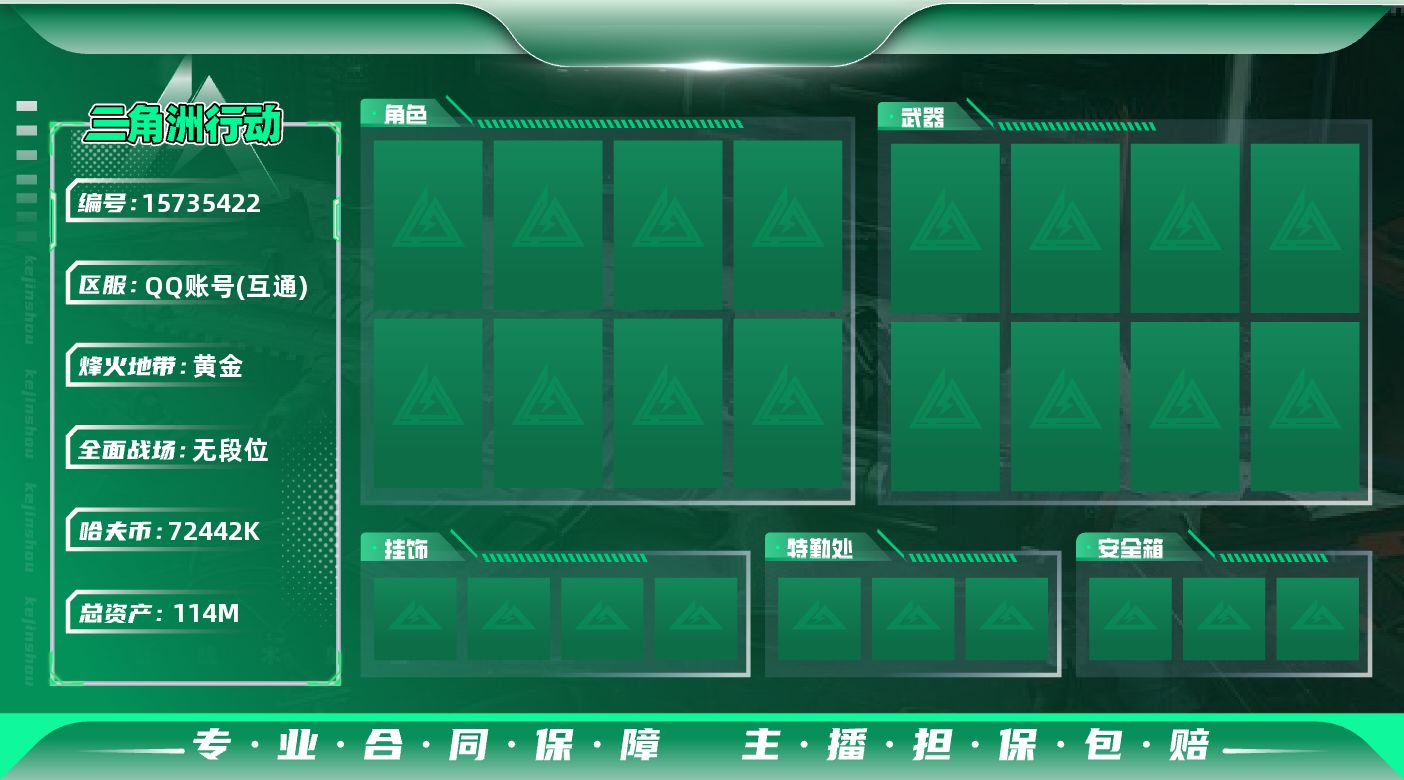 [15735422]【特价出售/店主推荐】114m总资产-72442k哈伏币-57烽火等级-黄金-1战场等级-无军衔 【近战皮肤】:近战-黑鹰 【稀有外观】:AKM突击步枪-肃杀,K437突击步枪-生存指令,MK47突击步枪-精英联盟,SMG-45-行动开启,勇士冲锋枪-冰天雪地,G18-星链科技,G18-哈夫克航天 【普通外观】:M4A1突击步枪-高雅黑,QBZ191突击步枪-三角洲力量,M7战斗步枪-红色涂装,SG552突击步枪-海浪,UZI冲锋枪-海色,野牛冲锋枪-高雅黑,M1014霰弹枪-海浪,SR-25射手步枪-黄蜂,SV-98狙击步枪-红色涂装,沙漠之鹰-海浪 【军牌】:军牌-幸福国,军牌-信誉优秀 【挂饰】:挂饰-窃风密探,挂饰-崩岩重炮*3,挂饰-暗行哨兵*6