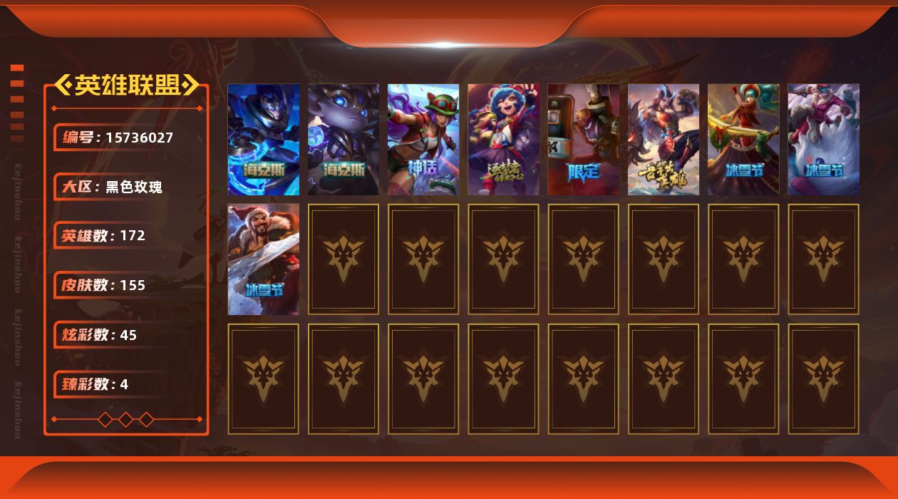 [15736027]【特价出售/店主推荐】未定级段位-172英雄-155皮肤-45炫彩-0终极-5神话-9限定-13传说-38史诗