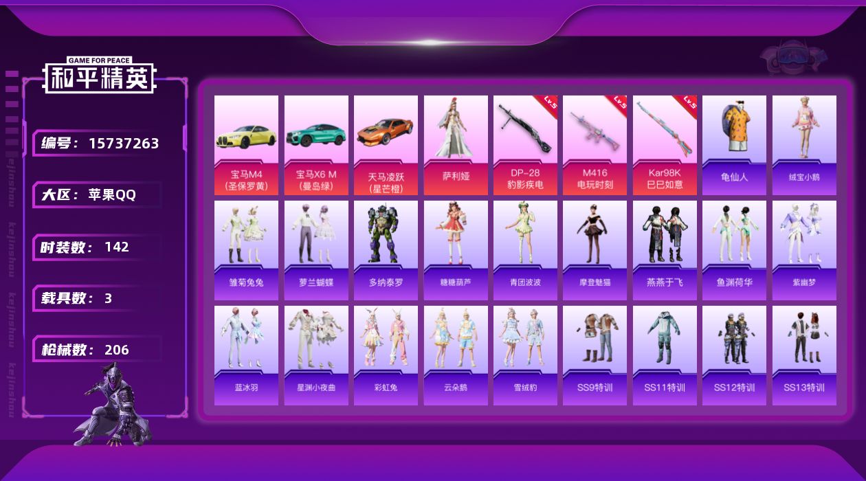 [15737263]【店主推荐捡漏号】苹果 手Q-1粉装-3特效枪-3载具-1粉色飞行器-63847热力值-8王牌印记-142套装-206枪皮【热门品类】:套装-龟仙人【粉色套装】:角色-萨利娅【粉色枪皮等级】:M416-电玩时刻(五级),Kar98K-巳巳如意(五级),DP-28-豹影疾电(五级)【粉色载具】:宝马M4(圣保罗黄),宝马X6 M(曼岛绿),天马凌跃(星芒橙)【粉色枪皮】:M416-电玩时刻,Kar98K-巳巳如意,DP-28-豹影疾电