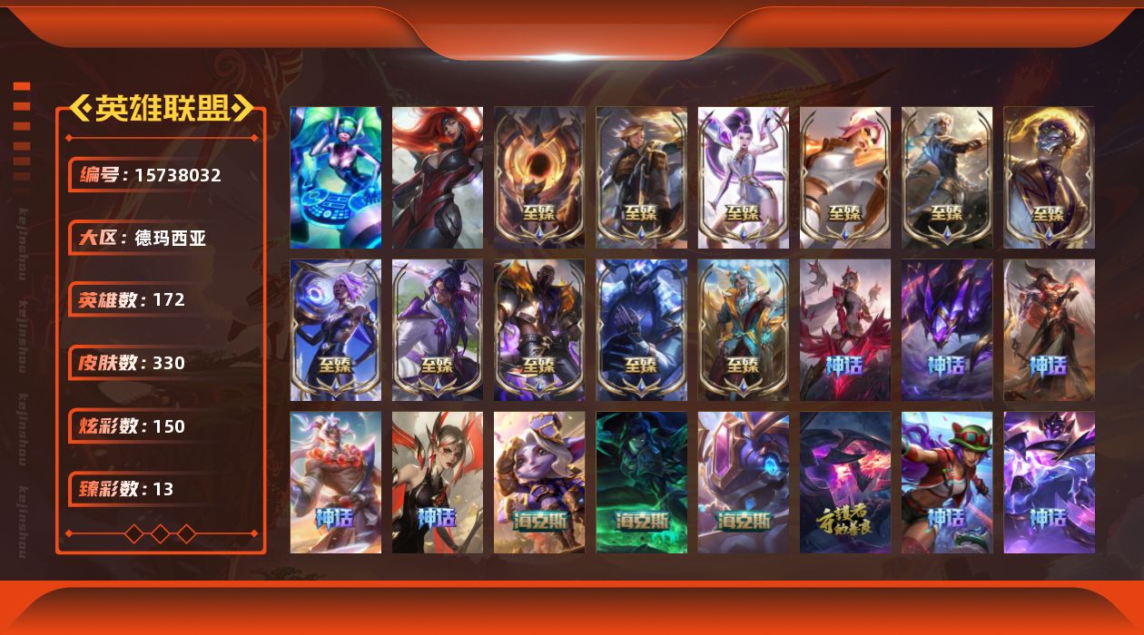 未定级段位-172英雄-330皮肤-150炫彩-2终极-24神话-39限定-39传说-59史诗